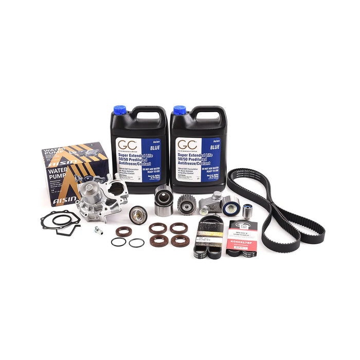 | Description_ASC | Package Includes: (x1) - AISIN Water Pump - 21111AA250, (x1) - KUZ Thermostat- 21200AA072, (x2) - CCI Coolant/Antifreeze 1-Gallon-Blue Super Extended Life 50/50 Prediluted, (x1) - Mitsuboshi Timing Belt - 13028AA240, (x1) - FHI Timing Belt Tensioner Assembly - 13033AA042, (x2) - Koyo Smooth Timing Belt Idler - 13073AA142, (x1) - NTN Small Timing Belt Idler - 13073AA230, (x1) - NSK Timing Belt Idler Gear - 13085AA080, (x1) - FHI Filtered Oil Feed Line Fitting w/ Raised Head - 14445AA090, (x2) - Oil Feed Line Copper Washer - 803912040, (x1) - NOK Front Crankshaft Seal - 806733030, (x2) - FHI Intake AVCS Cam Sprocket O-ring - 806939040, (x2) - FHI Intake/Exhaust AVCS Cam Seal - 806742160, (x2) - FHI Non-AVCS Exhaust Cam Seal - 806732160, (x1) - Mitsuboshi Power Steering / Alternator Belt - 5PK-0875, (x1) - Gates A/C Belt - K040317SF |