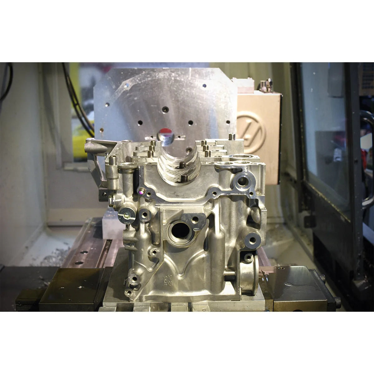 | Description_MKT | It's no secret that the OEM Subaru case halves, or "block," aren't exactly the strongest. IAG has developed a process to greatly improve the strength of the OEM Subaru EJ25 Case Halves to combat the effects of high cylinder pressures brought on by increased power and boost. Our proprietary "Closed Deck" System works by supporting the top of the cylinder in the weakest areas and prevents movement and expansion which can lead to cracks and failures. Despite the additional material supporting the cylinder walls, there is no concerns with overheating or coolant flow because the area around the middle of the cylinder still maintains the same coolant area. The custom IAG closed deck inserts are machined with holes for oil and coolant to pass through the same as stock. The IAG 1150 EJ25 Closed Deck Case features threaded and indexed case bolt covers on top of our strongest closed deck inserts. We also machine the 1150 case for Fire-Lock™ head gaskets, 14mm head studs, and add pinned mains and ARP case hardware for ultimate strength. If you're one of those people who prefer to do your own builds we now offer our legendary closed deck case halves for purchase separately. Simply install your crank, rods, and pistons to your own specifications and be confident that the case halves will take the power and prevent common cylinder wall failures. The IAG Closed Deck conversion is performed 100% in-house by our engineers and experts using state-of-the-art equipment. The IAG Closed Deck starts with a new OEM EJ25 bare case. The case is loaded and fixtured to a 4th axis rotary indexer in our Haas VF4-SS CNC Vertical Machining Center. It is supported by the main journals using a precision ground 2-inch bar and tailstock which ensures the datum is the main journals. This method gives us a true reference point to perform all machining operations. A Rennishaw probe is utilized to check that the case is fixtured true, and once confirmed the machining process begins. |