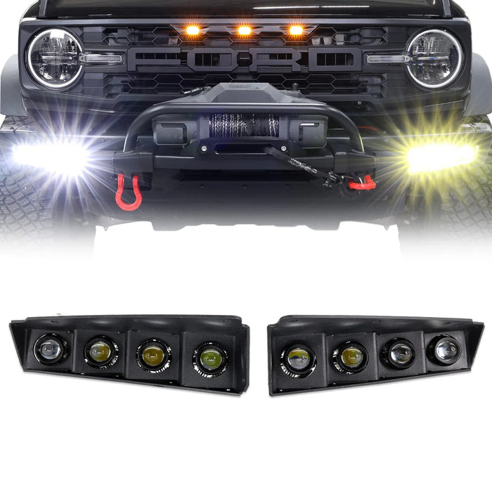 | Description_MKT | The IAG I-Line 4 Lamp Fog Light Kit is designed to be used with your Bronco’s optional modular bumper. This heavy-duty lighting kit adds additional front lighting for driving at night or in bad weather, and is durable enough to handle off-road conditions. The IAG I-Line 4 Lamp Fog Light Kit is easy to install with the provided wiring harness to your factory auxiliary switches or aftermarket switch panel. IP67 rated, these lights are designed to be waterproof. The I-Line Fog Light Kit is designed to work with your auxiliary switch panel and features individual wiring for each light color to allow toggling between the white and amber LED lights depending on driving conditions. When both colors are toggled on the amber light overrides the white lights. Alternative methods of installation are possible with modifications. This fog light kit is designed to work with your Bronco’s optional factory switch panel. If your Bronco is equipped with AUX switches there is no need to install another switch. |
