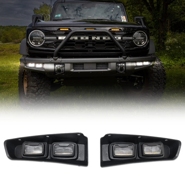 | Description_MKT | cool white LED and amber yellow fog lights. This lighting kit can be installed in under thirty minutes, as there is no manual wiring required, and operates using your Bronco’s factory switches in conjunction with the headlights. |