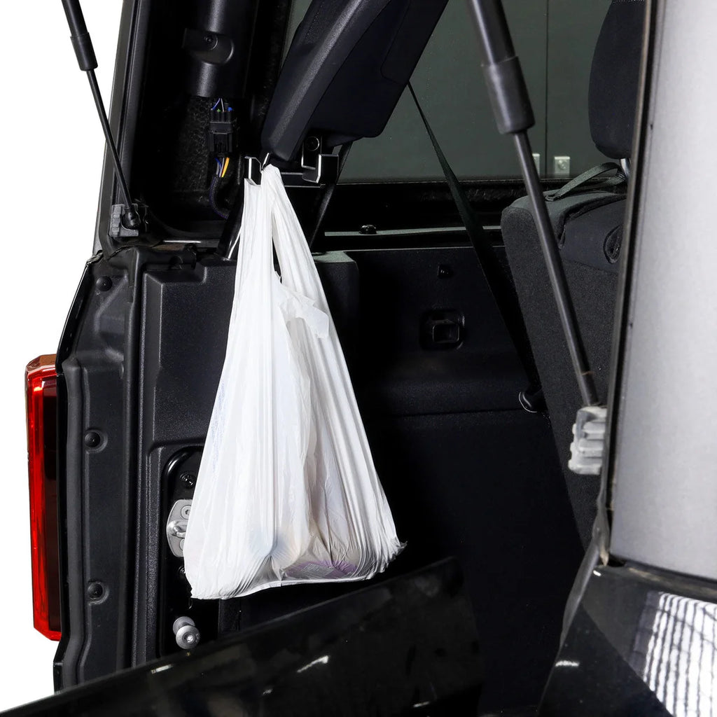 | Description_MKT | Keep grocery bags from tipping and loose items from rolling around in your Bronco’s cargo area with the IAG I-Line Rear Trunk Hook set. These handy hooks can be stacked to create multiple hooks from one mounting point, and install directly into the factory bolt holes using the original factory hardware. Keep items from rolling out of the rear hatch by keeping them securely hung on these Rear Trunk Hooks. Not only will your cargo compartment stay organized, but your valuables will be safe and secure. |