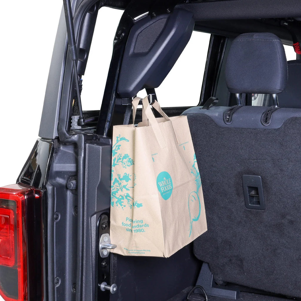 | Description_MKT | Keep groceries in their bags and loose items from rolling around in your Bronco’s cargo compartment with the IAG I-Line Rear Trunk Hook set. These handy organizational hooks install right into factory bolt holes using the original factory hardware. Eliminate the worry of items accidentally rolling out of the rear hatch when you open it by keeping items securely hung on the hooks. |