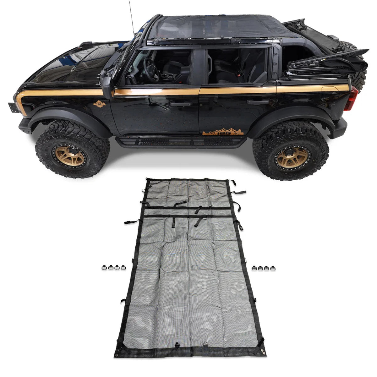 | Description_MKT | The IAG I-Line Top Only Sunshade covers the front and rear passenger area as well as the rear cargo area of your 2021+ Ford Bronco. This sunshade allows you to put the top back without the fear of getting sunburned. The lightweight nylon mesh material provides some much needed shade to your occupants and cargo on hot days. The shade can be used while the vehicle is in motion or stopped. It’s perfect for a day at the beach or going topless on the trail on a nice day. |