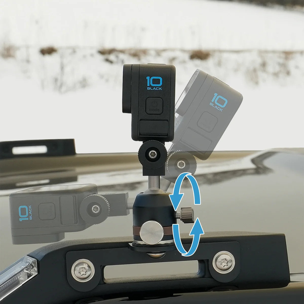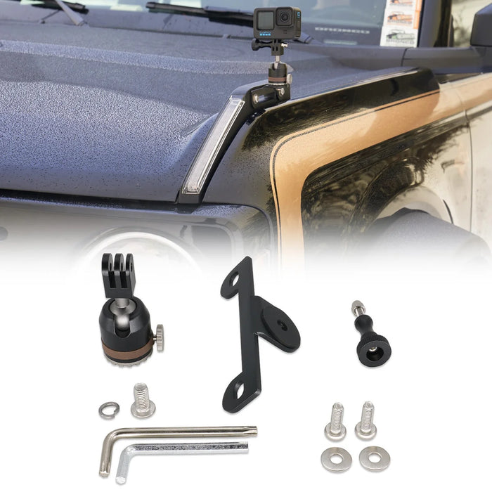 | Description_MKT | Get ready for adventure with the IAG I-Line Trail Sight Action Camera Mount. This heavy-duty camera mount is designed to securely attach a GoPro or similar action camera to the trail sights on your 2021+ Ford Bronco’s hood. Whether you want to capture your favorite off-road trails, or you use a camera to document your commute, IAG’s Action Camera Mount is the perfect companion to get a clear shot of the road, without interference or glare from your windshield. IAG’s Action Camera Mount features a ball mount design that allows for 360 degree rotation, as well as vertical adjustment so that you can position your camera for the perfect shot. Simply loosen the positioning dials by hand and move into the desired angle. Once tightened, your camera will stay firmly in place. Bumpy roads and rough terrain will not affect your camera's stability, it will maintain its position regardless of rough terrain and uneven surfaces. Removing the camera for safe storage is just as easy- the camera detaches from its mount by loosening the included mounting hardware, eliminating the worry of leaving it unattended in public places. |