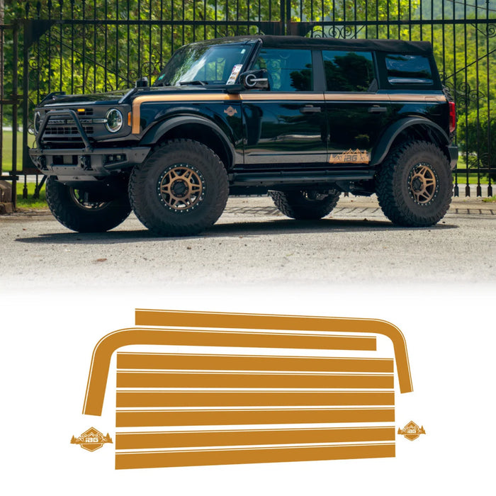| Description_EXT | IAG Off-Road Boss Style Vinyl Side Stripe Kit fits 2021+ Ford Bronco 4 Door - Gold |