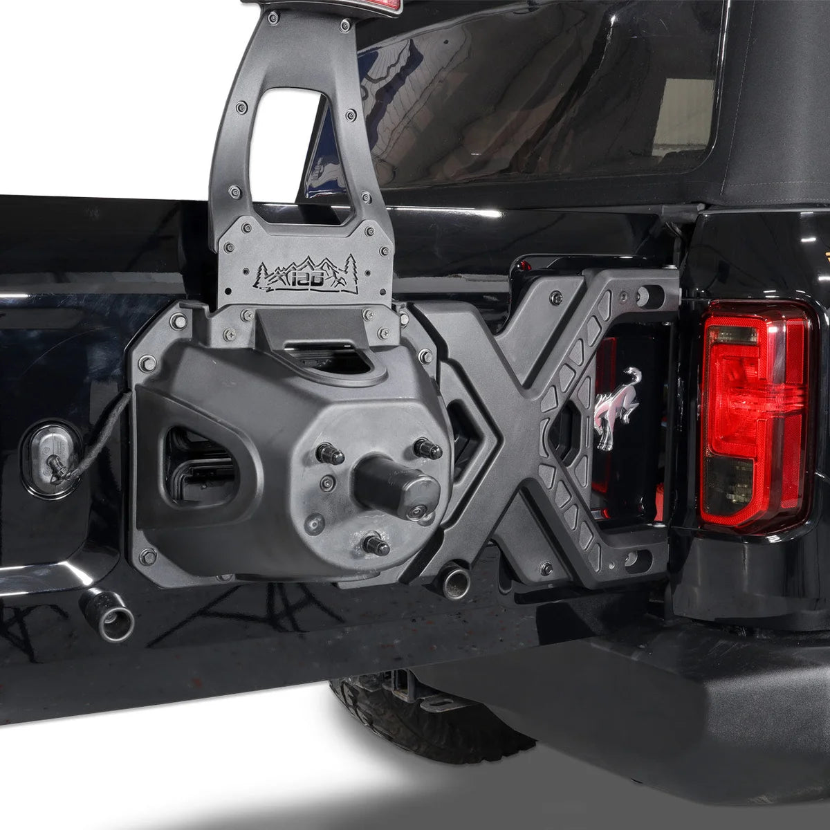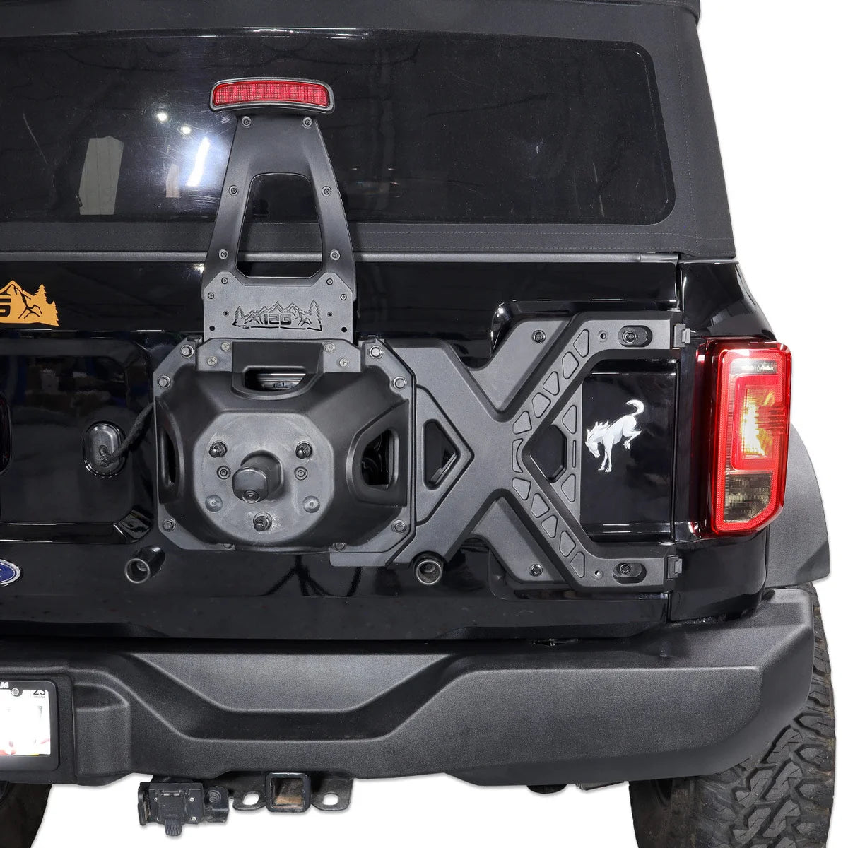 | Description_MKT | If you've upgraded your wheels and tires on your Bronco you need this brace! The IAG X-Brace Tailgate Hinge Reinforcement is designed to support your Bronco's hinge, as well as spread the load of the spare tire across the tailgate. It's no secret that big tires are heavy! That new 37" Spare tire on your Bronco puts significant stress on the stock hinge assembly and can lead to sagging. On top of that, the larger spare tire is likely to distort the metal of your stock tailgate- especially when bouncing around on trails. The IAG X-Brace spreads the load across the tailgate and prevents these issues, plus it looks awesome on the back of your Bronco! Weighing nearly 25 lbs, you'll feel the quality and strength as soon as you pick it up. The hinges feature brass bushings to ensure trouble-free operation. The X-Brace is finished in an attractive black powder coated finish for an OEM style appearance. The IAG X-Brace Tailgate Hinge Reinforcement System is accessory ready. We've included two M10x1.50 threaded holes to eaisly mount our upcoming line of accessories such as Off-Road Flag Mounts, Jerry Can Mounts, or Off-Road Jack Holders. |