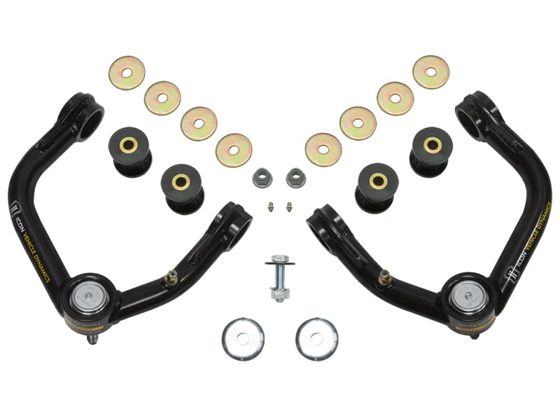 Through hours of in-house research and thousands of miles of real world testing, ICON engineers have identified the limiting factors of the 1996-2004 Toyota Tacoma and 1996-2002 Toyota 4Runner OEM upper control arms and developed a kit to address these limits. Like all ICON tubular upper control arms, these are constructed from CNC bent 1026 DOM steel tubing and then powder coated to a semi-gloss black finish for maximum strength and corrosion resistance. These arms are engineered with built-in geometry correction for optimal alignment specifications and increased caster for confidence inspiring handling. The robust, two piece steel taper adapter clamps from both sides of the spindle to distribute the extreme forces seen during aggressive off-road driving while CNC machining provides a precise, OE style fit for the Delta Joint taper pin. These upper control arms feature ICON's patented Delta Joint. The Delta Joint is a heavy duty high angle ball joint that combines the durability of a ball joint with the performance characteristics of a traditional uniball. While the industry standard uniball does a great job of allowing the control arms of a vehicle to articulate with little bind, they do have an inherent weakness that leaves more to be desired when used in a daily driven application - exposure to the elements. The Delta Joint features a zinc plated housing providing the first layer of corrosion resistance, while a tough grease seal keeps potentially harmful elements out of the inner workings of the joint. Metal on metal construction and a greasable design increase the longevity of the Delta Joint while at the same time allowing for noise-free operation. What makes the Delta Joint unique is that it brings the best of both worlds to ICON upper control arms with features that make it more robust than a uniball, and at the same time capable of greater angularity than a typical ball joint.