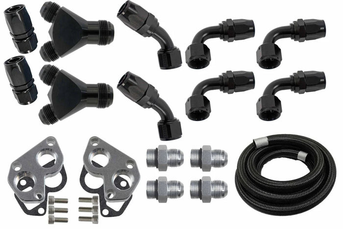 Water Pump Plumbing Kit - Water Pump Spacer / Gaskets / Nylon Braided Hose / Fittings / Hardware Included - 12 AN Ports - 16 AN Male Inlet and Outlet - Aluminum - Clear Anodized - GM LS-Series - Kit