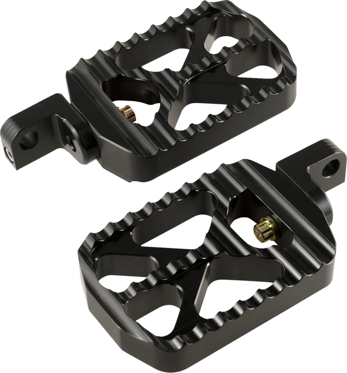 Serrated for exceptional grip and look. Strong yet light weight aluminum CNC machined 2 pieces construction. 4.21" (10.69 cm) long x 2.87" (72.9 mm) wide x 0.8" (20.32 mm) thick. Ride position leveling screw to avoid footpeg slag related issues, common on HD footpeg mounts. Easy installation. Made in the USA.