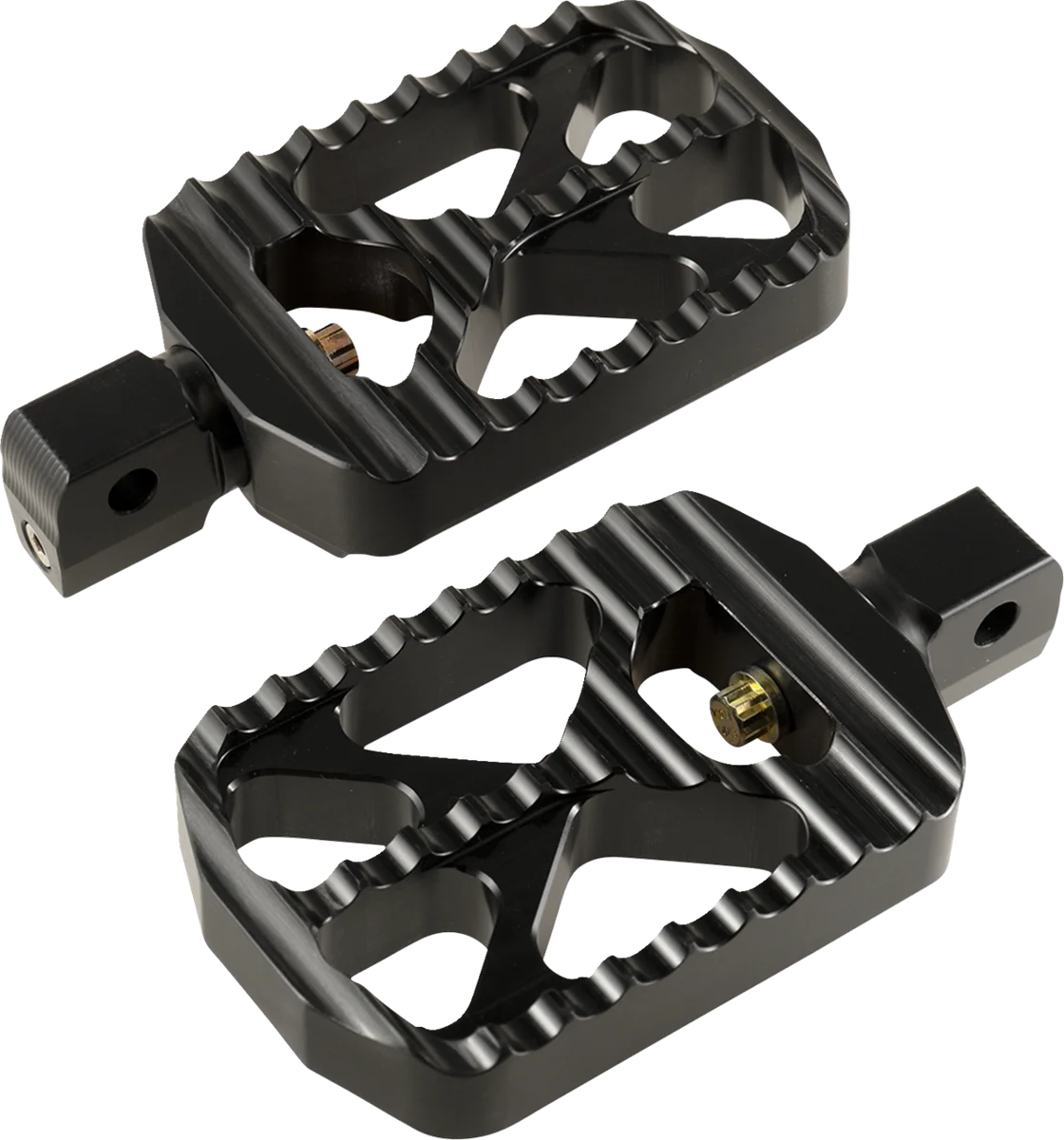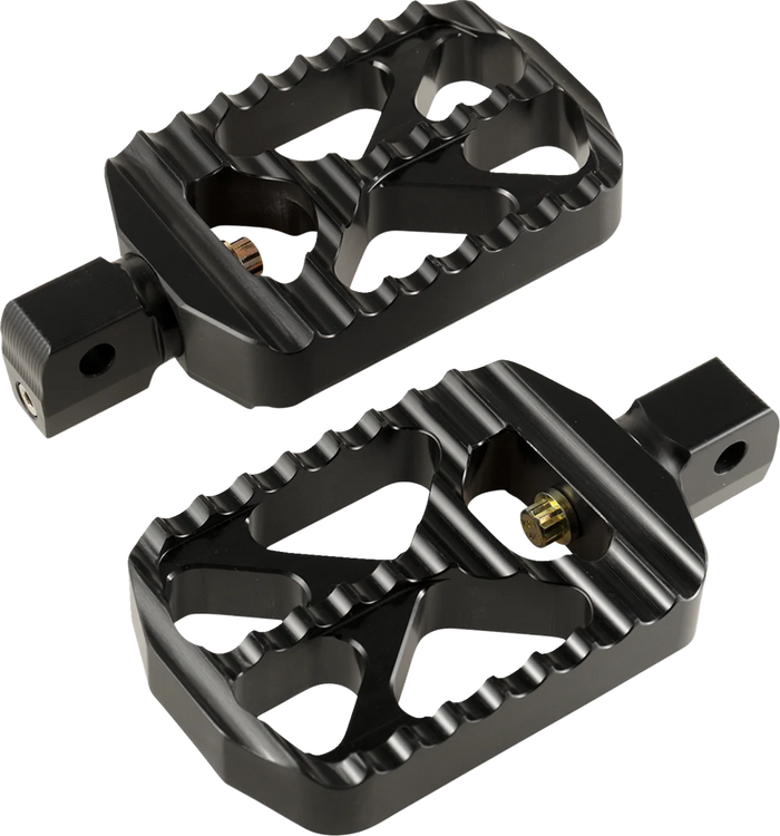 Serrated for exceptional grip and look. Strong yet light weight aluminum CNC machined 2 pieces construction. 4.21" (10.69 cm) long x 2.87" (72.9 mm) wide x 0.8" (20.32 mm) thick. Ride position leveling screw to avoid footpeg slag related issues, common on HD footpeg mounts. Easy installation. Made in the USA.