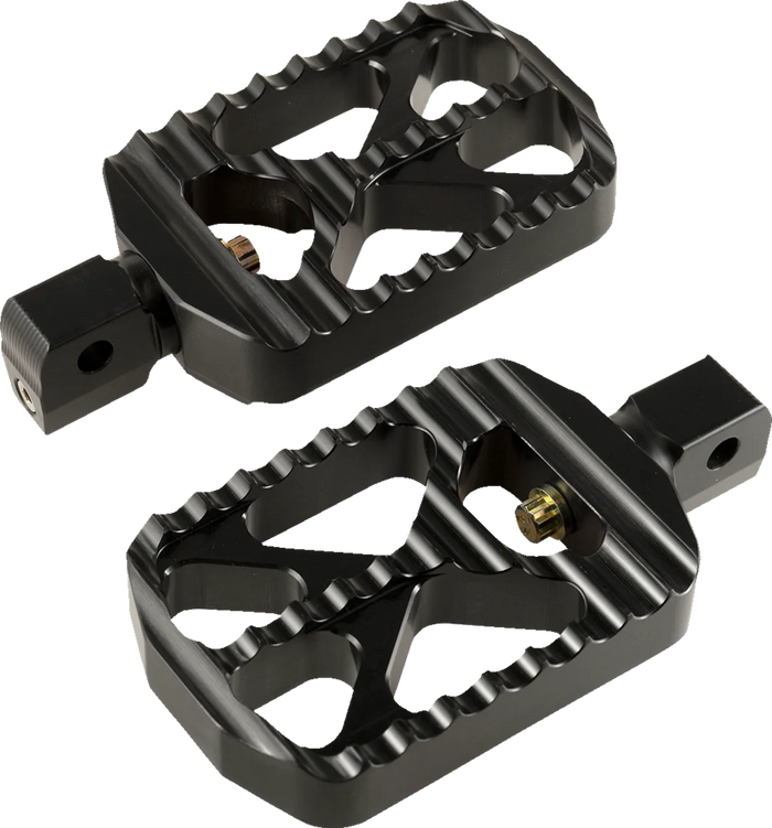 Serrated for exceptional grip and look. Strong yet light weight aluminum CNC machined 2 pieces construction. 4.21" (10.69 cm) long x 2.87" (72.9 mm) wide x 0.8" (20.32 mm) thick. Ride position leveling screw to avoid footpeg slag related issues, common on HD footpeg mounts. Easy installation. Made in the USA.