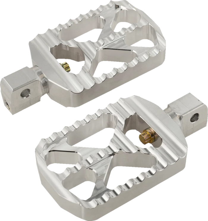 Serrated for exceptional grip and look. Strong yet light weight aluminum CNC machined 2 pieces construction. 4.21" (10.69 cm) long x 2.87" (72.9 mm) wide x 0.8" (20.32 mm) thick. Ride position leveling screw to avoid footpeg slag related issues, common on HD footpeg mounts. Easy installation. Made in the USA.