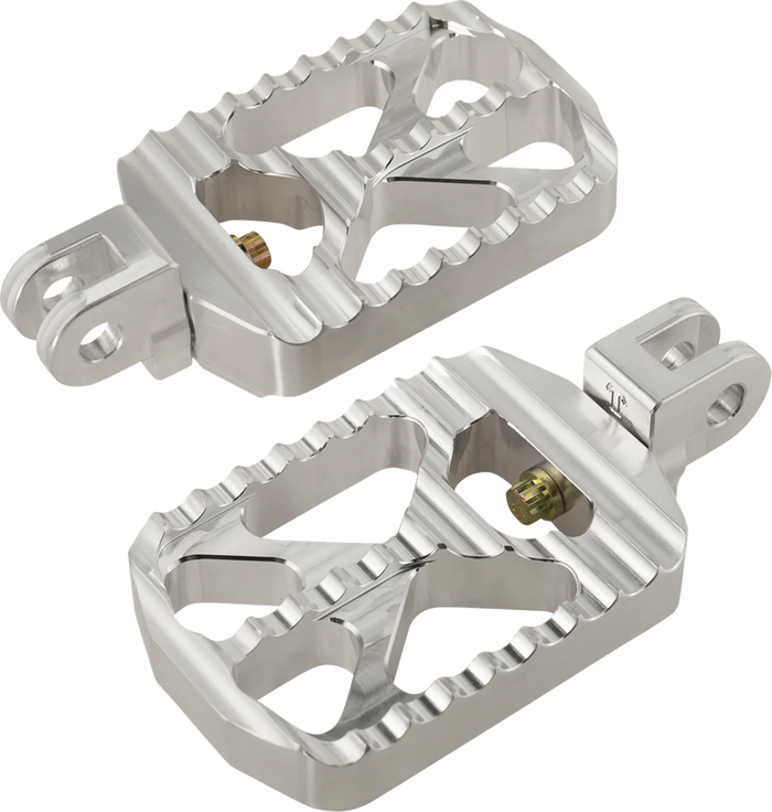 Serrated for exceptional grip and look. Strong yet light weight aluminum CNC machined 2 pieces construction. 4.21" (10.69 cm) long x 2.87" (72.9 mm) wide x 0.8" (20.32 mm) thick. Ride position leveling screw to avoid footpeg slag related issues, common on HD footpeg mounts. Easy installation. Made in the USA.