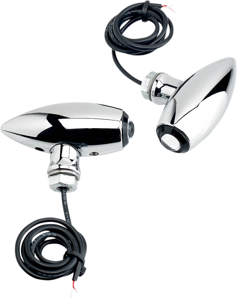 Bullet-style super-bright LED turn signal/marker lights really clean up the look of your bike. Each features nine intensely bright LEDs in a cluster module for light output, amazing for its size (roughly 3/4" diameter at the light source). All parts are fully CNC-machined from 6061 T-6 billet aluminum. May be rotated into virtually any upward-and-downward setting. Dimensions: a little over 1" diameter, 2-3/8" long, and stand off the bike 1-1/2". Center-Mount Turn Signal Marker Lights can be mounted in almost any 5/16" or 8mm hole; wires feed through a pre-drilled hole in the mounting bolt. Made in the U.S.A.. If being used as turn signals, a load equalizer may be required. Not DOT compliant.