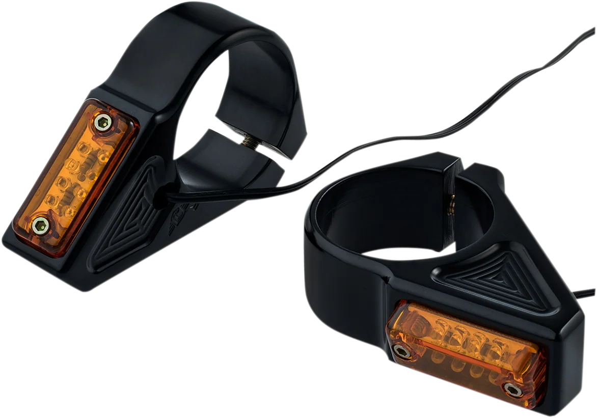 CNC-machined from solid blocks of 6061-T6 billet aluminum. Pitch bolt mounting design for a clean look. Can be mounted either inward or outward from the fork tubes. Super-bright amber LED lights. 1½" wide, ½" tall; lights are set at a 25° degree angle for standard HD forks. 2½" wide from center of fork tube to the end of the light. Made in the U.S.A..