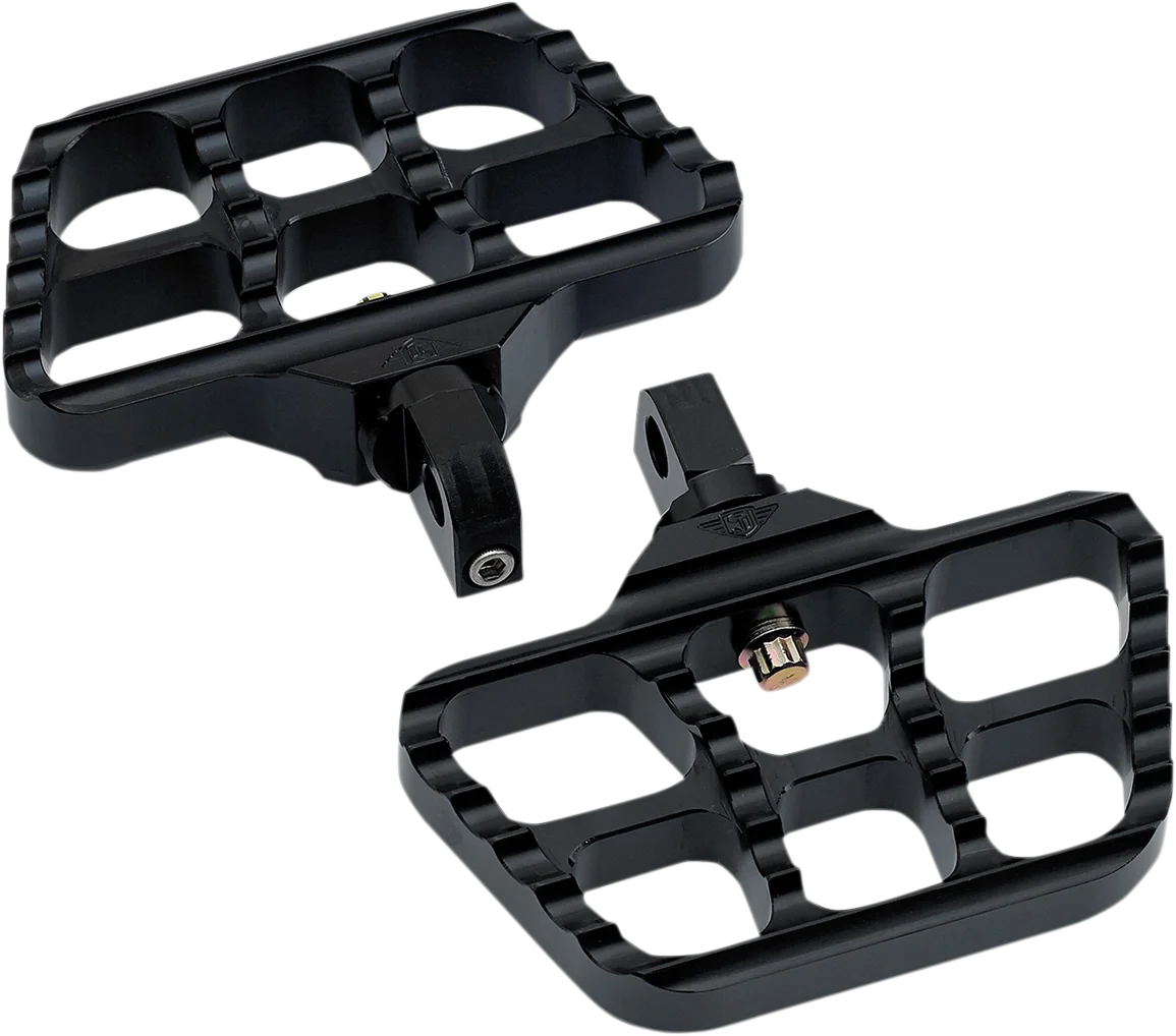 CNC-machined from 6061 billet aluminum. Strong yet lightweight two-piece construction. Serrated for exceptional grip. 360° footpeg adjustment. Pitch adjustment screw for a level riding position. Easy installation. Made in the USA.