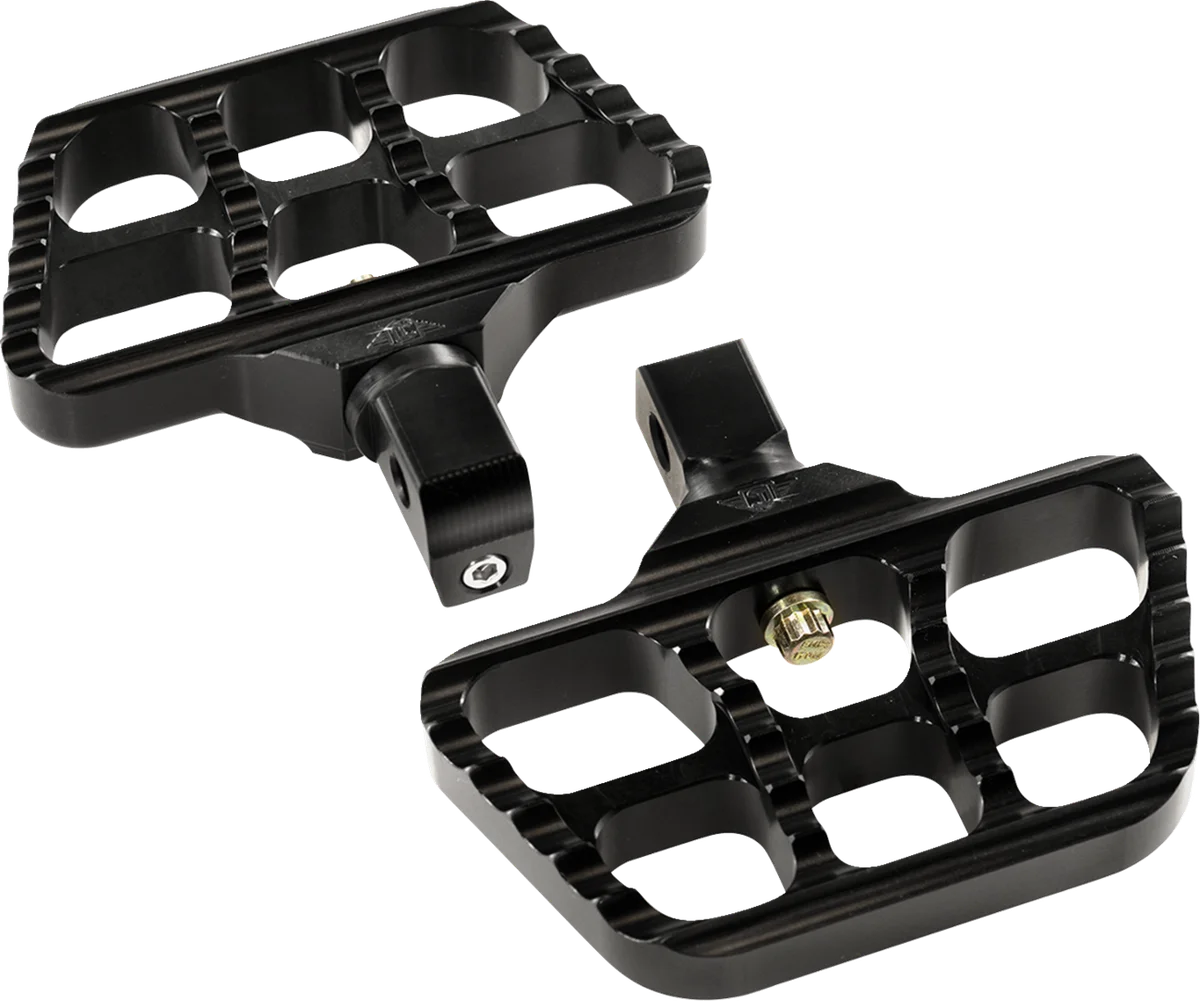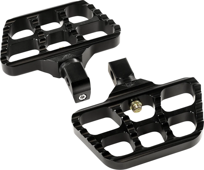 CNC-machined from 6061 billet aluminum. Strong yet lightweight two-piece construction. Serrated for exceptional grip. 360° footpeg adjustment. Pitch adjustment screw for a level riding position. Easy installation. Made in the USA.