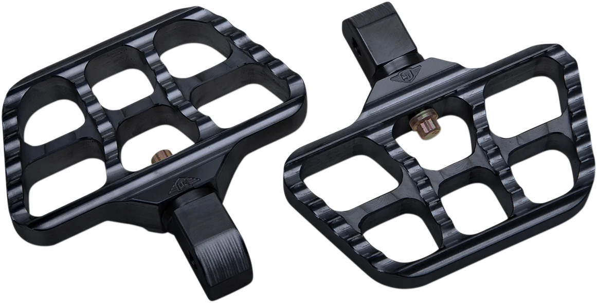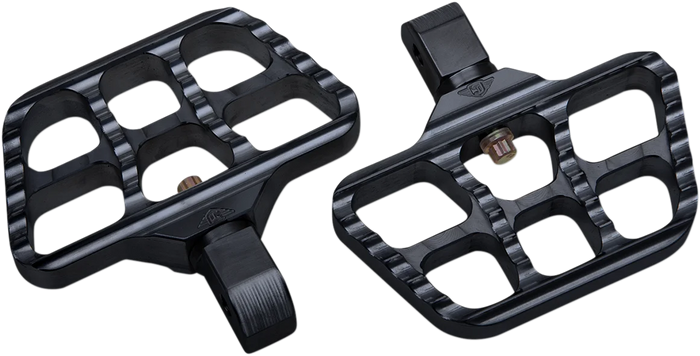 CNC-machined from 6061 billet aluminum. Strong yet lightweight two-piece construction. Serrated for exceptional grip. 360° footpeg adjustment. Pitch adjustment screw for a level riding position. Easy installation. Made in the USA.