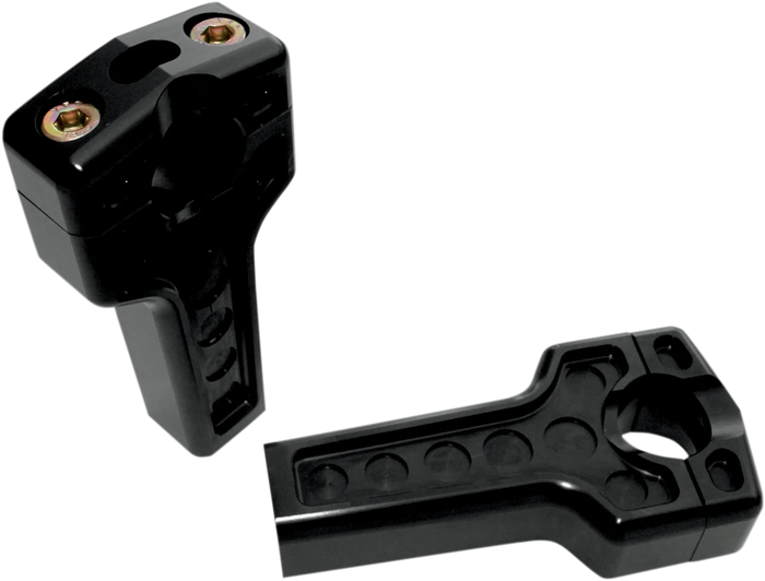 Replace your heavy "cast" handlebar risers with one of these high-performance all-billet aluminum riser sets. Fully CNC-machined racing styled design is made from solid 6061 T-6 bar stock for maximum strength. Special alloy gold zinc top clamp mounting bolts are included. Lightweight "dual" design top clamps give your bike a unique "cafe racer" look. 2" or 4" tall risers are tapped for 1/2"-13 bolts (sold separately). Designed for 1" diameter bars. Made in the U.S.A..