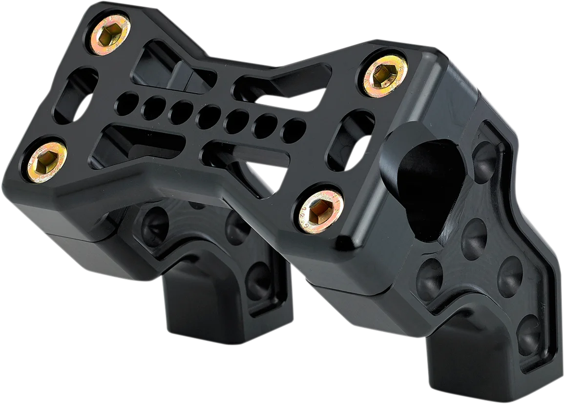 Fully CNC-machined Racing styled design. Made from solid 6061-T6 bar stock for maximum strength. Fits 1" handlebars. Riser bases are threaded 1/2"-13 for Harley-Davidson upper tree applications. Lightweight bridge style top clamp. Top clamp measures 1.1" x 2.4". Made in the U.S.A..
