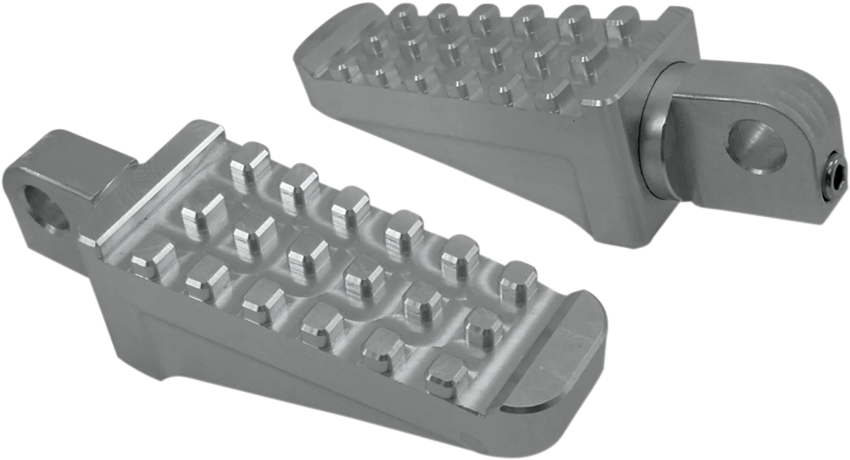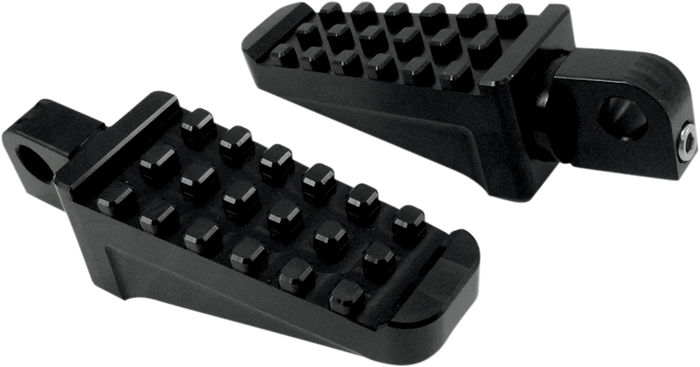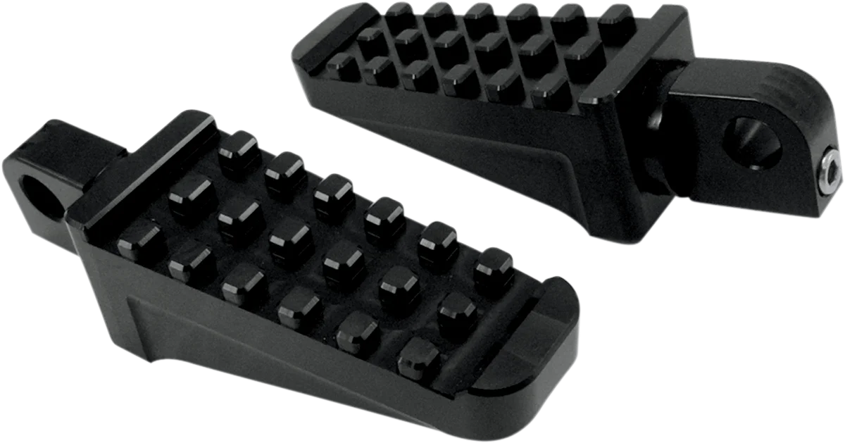 Footrests feature an intricately CNC-machined tread pattern in the top surface for optimal footing. Much lighter than stock and have an angled design for better road clearance when cornering. Replaces stock rubber or cast iron units. Machined from solid blocks of 6061 T-6 billet aluminum. Full 360° footpeg rotation makes these footpegs perfect for any application. Male-mount footpegs have Joker's exclusive pitch adjustment screw to maintain the proper upward angle of the peg. Super strong, yet lightweight one-piece construction. Installs easily to most stock H-D shift arms with a threaded 5/16"-24 mounting hole (replaces the stock rubber unit). Made in the USA.