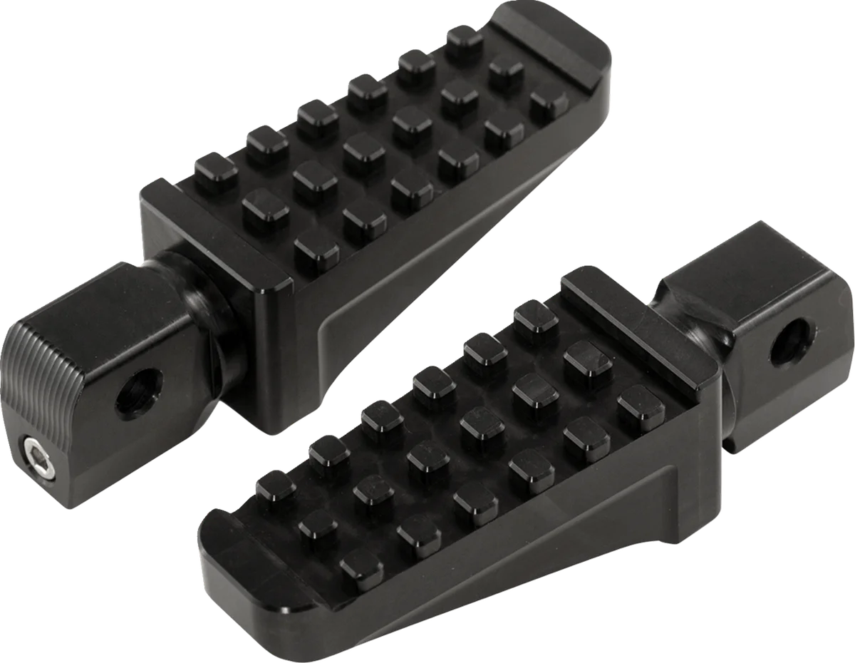 Fully CNC machined from solid 6061-T6 bar. Super strong, yet light-weight 2 piece construction. Wider foot surface for a comfortable ride. Short design gives you more lean angle. Serrated surface provides a good bite to the bottom of your shoe. Full 360 degree footpeg rotation makes these footpegs perfect for any application. Pitch adjustment screw always keeps them in a good riding position. Made in the USA. Will not fit Indian passenger peg mounts..