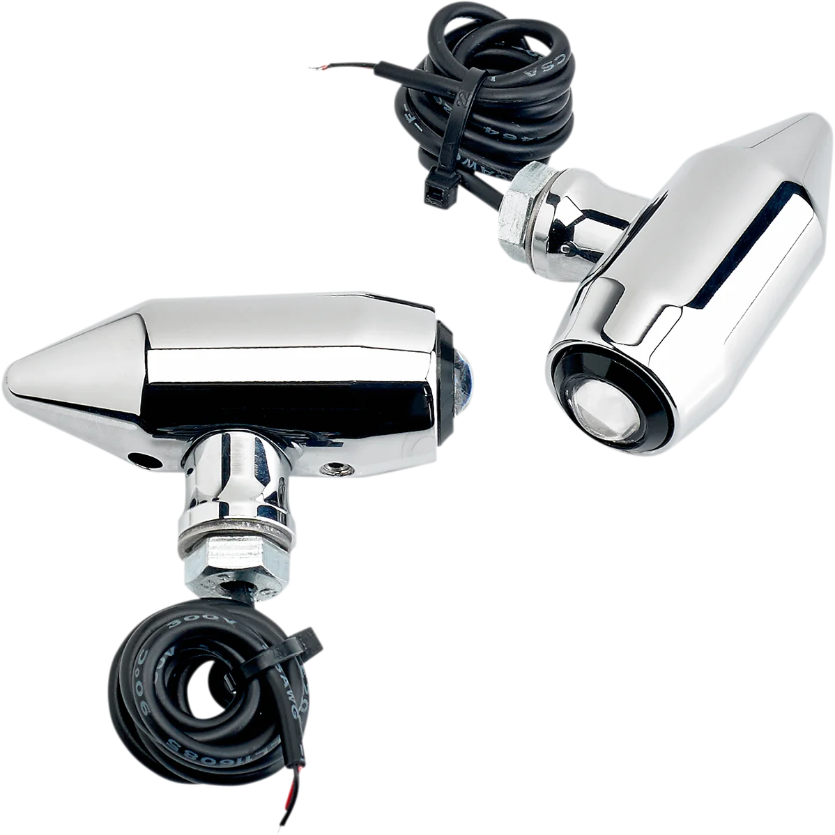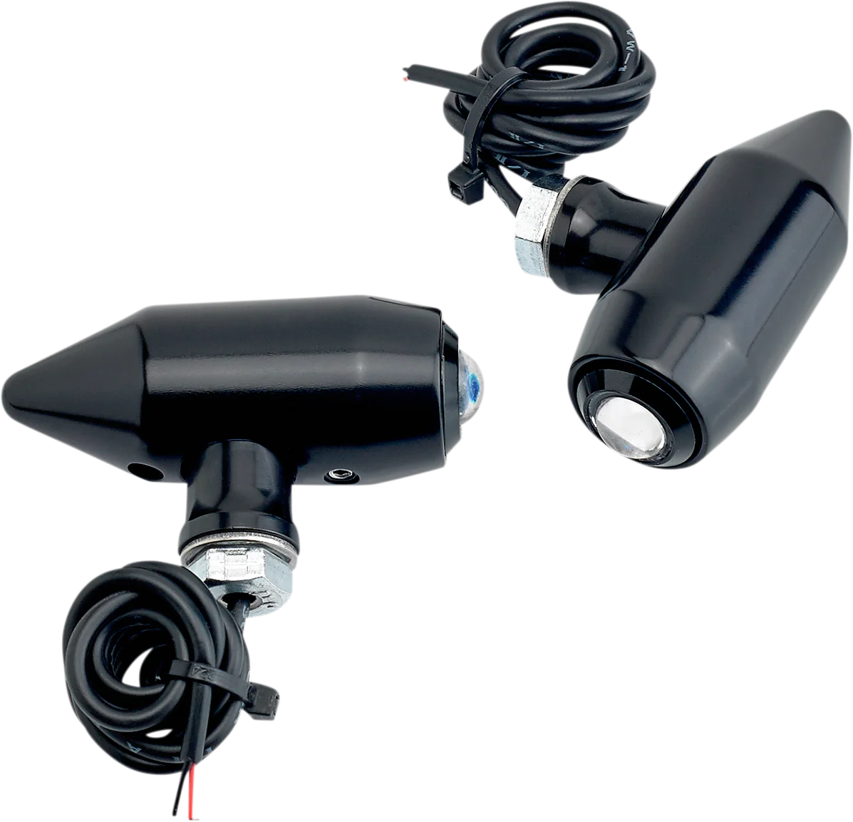 Feature an intensely bright nine LED cluster in small (3/4" diameter) light source. Turn signal body measures 2-3/8" L x 1" diameter, stand 1-1/2" from mount point. All parts are fully CNC-machined from 6061 T-6 billet aluminum. Can be rotated into almost any upward/downward setting. Single function. Center-mount style can be mounted in almost any 5/16" or 8mm hole; wires feed through a pre-drilled hole in the mounting bolt. Made in the U.S.A.. Not DOT compliant..