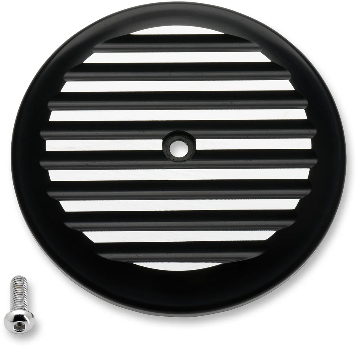 Covers the outside of the air filter when replacing the existing air cleaner cover. Fits over a 5.5" area; overall outside diameter is 5.75". All necessary mounting hardware included. CNC-machined from billet aluminum. Made in the USA.