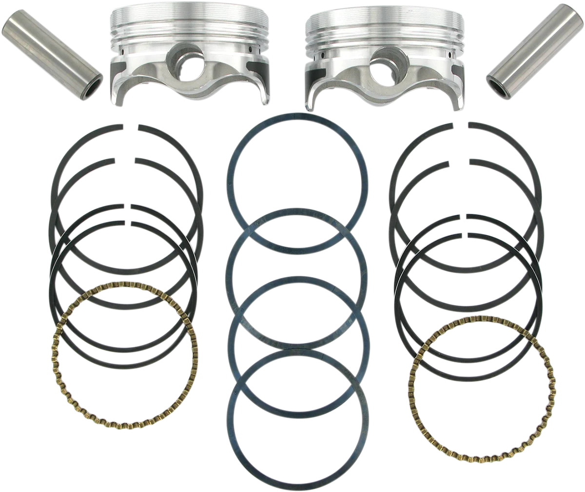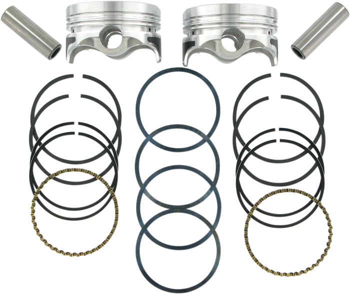 Pistons forged from 4032 aluminum alloy. Offset pin design for quiet operation. Each kit contains two pistons, pins, spiral-lock pin clips and Hastings moly rings. Piston pin lock rings available separately. Replacement rings are also available separately.