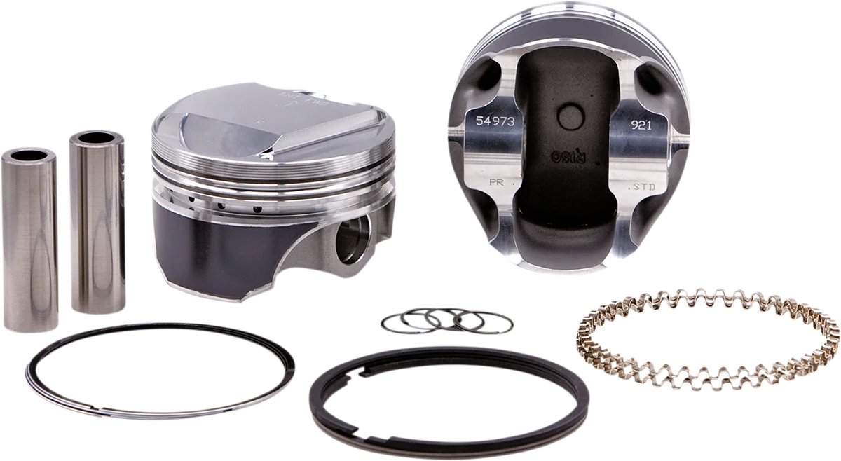 Pistons forged from 4032 aluminum alloy. Offset pin design for quiet operation. New superior coated skirts. Each kit contains two pistons, pins, spiral-lock pin clips and Hastings moly rings.