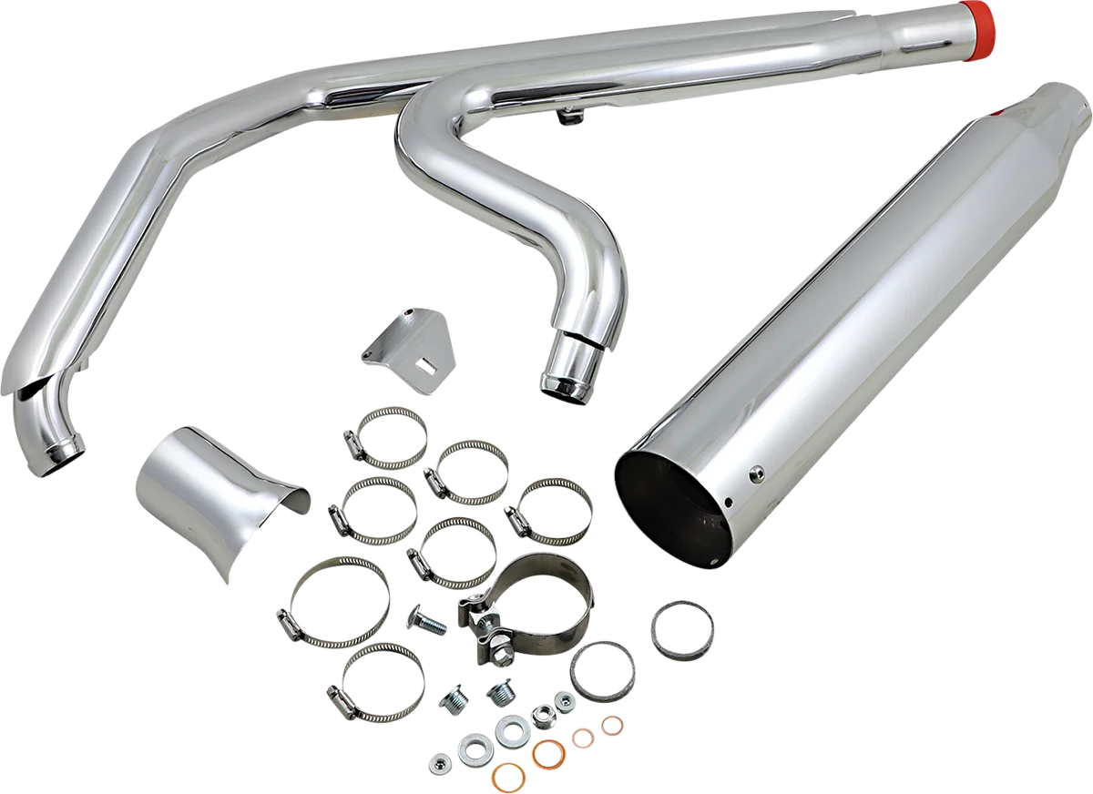 Designed to increase horsepower and torque while providing an aggressive, low-frequency sound level. 1.75” to 1.875” to 2” high-flow 16-gauge stepped primary headers with a 2.5” collector. 4.5” diameter, 16-gauge HP-Plus muffler with 2.5” inlet. Removable 1.5” absorptive baffle with 3” reverse cone outlet to maximize torque; baffle is wrapped in stainless steel wool and high-temp fiberglass for a rich, mellow tone. 2.50”, 220°, 16-gauge heat shields. 18 mm and 12 mm O2 bungs welded into the primaries. Optional Ghost pipe available separately to give a 2-into-2 look. Made in the U.S.A..