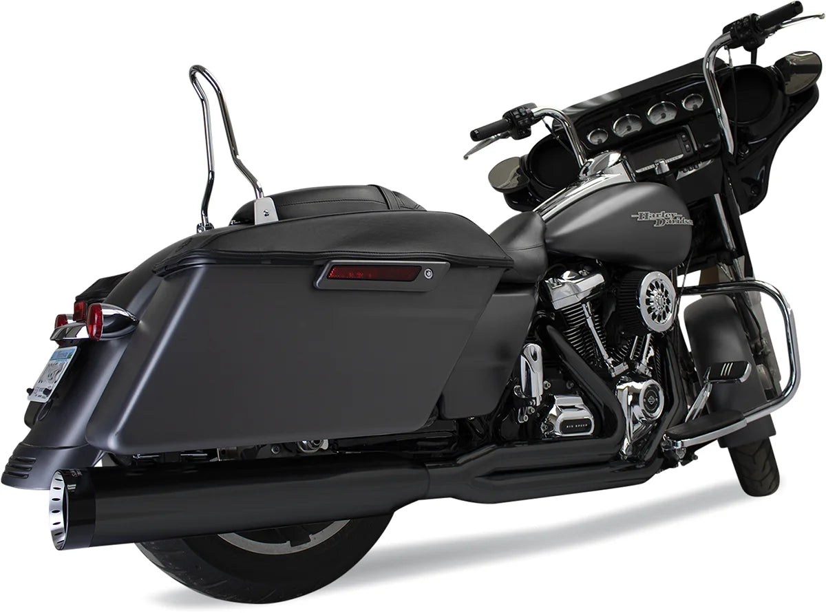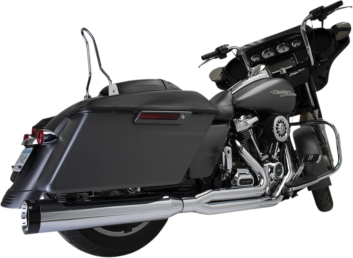 Designed to increase horsepower and torque while providing an aggressive, low-frequency sound level. 1.75” to 1.875” to 2” high-flow 16-gauge stepped primary headers with a 2.5” collector. 4.5” diameter, 16-gauge HP-Plus muffler with 2.5” inlet. Removable 1.5” absorptive baffle with 3” reverse cone outlet to maximize torque; baffle is wrapped in stainless steel wool and high-temp fiberglass for a rich, mellow tone. 2.50”, 220°, 16-gauge heat shields. 18 mm and 12 mm O2 bungs welded into the primaries. Optional Ghost pipe available separately to give a 2-into-2 look. Made in the U.S.A..