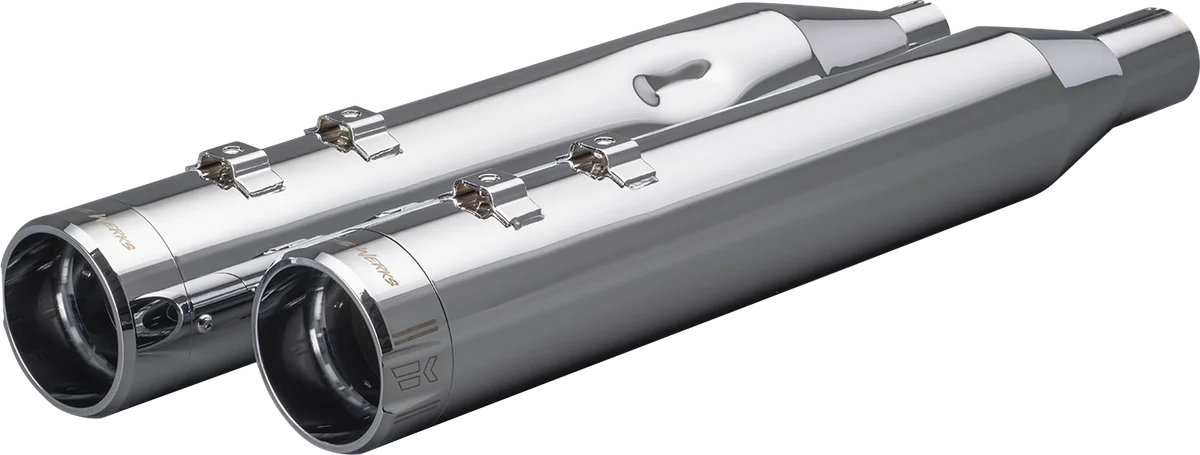 Engineered for performance, style and sound. Produces the Khrome Werks signature authoritative tone without annoying high-frequency noises. 4-1/2" 16-gauge muffler body. Comes in chrome with blunt-end chrome tips. Laser-etched logo and accents. Absorptive baffle covered with stainless steel mat and high-temperature fiberglass. Improved torque and horsepower from the hit of the throttle. Billet aluminum tips can be rotated 360° at 90° increments; feature a high-temperature powdercoated finish. Sold in pairs. Made in the U.S.A..
