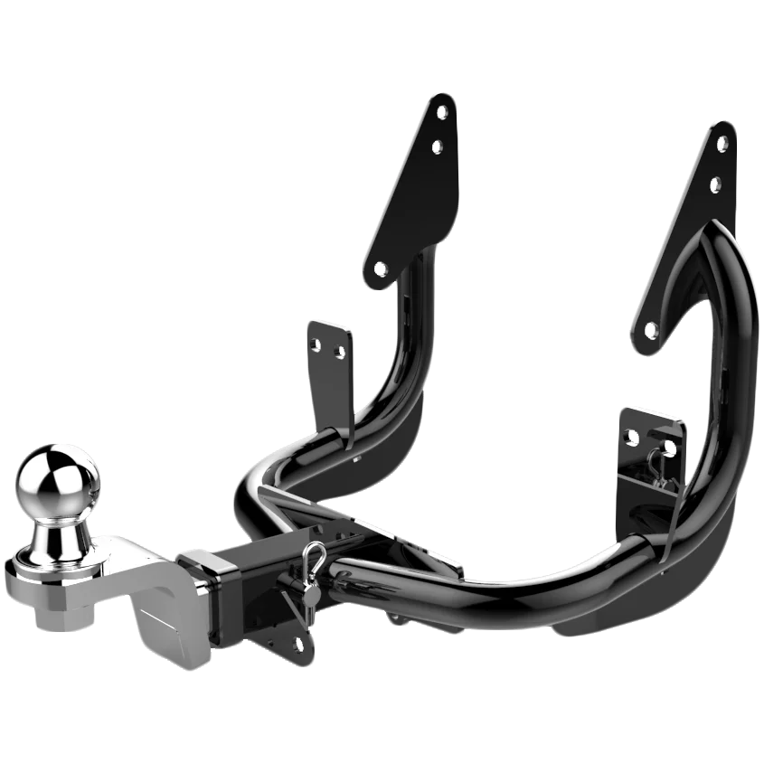 1-1/4" receiver trailer hitches mount to frame struts and the saddlebag supports. Does not interfere with accessories such as docking kits for sissy bars, racks and tour boxes. Made from .125" 1020 steel tubing, robotic-welded and high-gloss black powder-coated. Safety chain and 5 pin male/female connector brackets included. Includes polished chrome-plated hitch, 1-7/8" ball and pin with hitch clip. Made in the U.S.A..