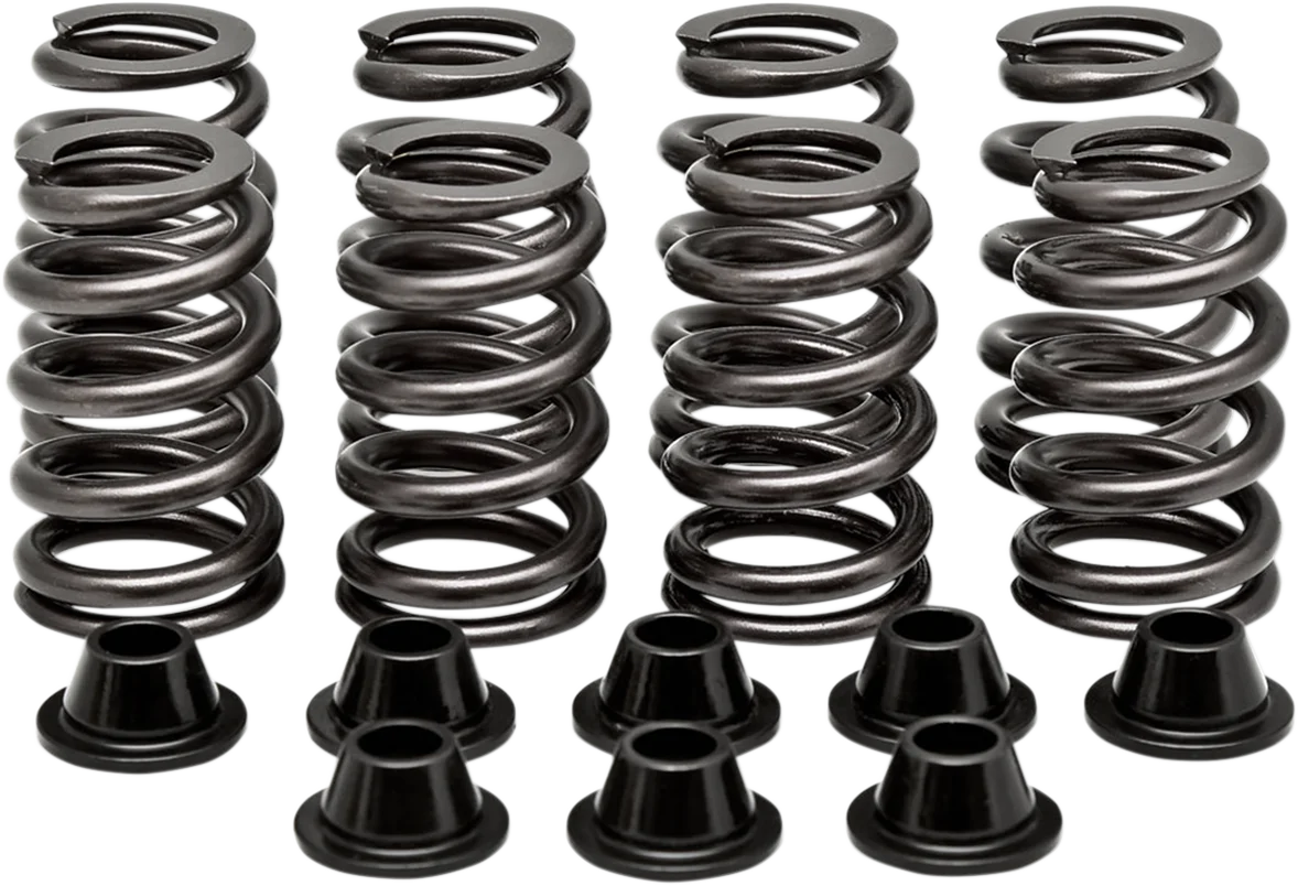 By taking advantage of the latest development in valve spring wire chemistry and manufacturing techniques, By coupling these developments with strict KPMI® design protocols and employing multiple design simulation and FEA analysis software, we were we able to overcome the torsional stresses unique to ovate wire springs that previously limited their operating parameters. KPMI® Beehive Springs are progressively wound using Kobe Super-Clean chrome silicon based wire that is heat treated and shot peened. KPMI® uses its tightly toleranced, FEA designed hardened Titanium retainers in these applications to ensure correct assembly height and resist keeper pull through. The hardened steel basewashers included in these kits are designed to locate the spring and control lateral movement.. KPMI® has developed ovate wire Beehive style springs that will live and perform at a high level in Husqvarna® and KTM® applications..