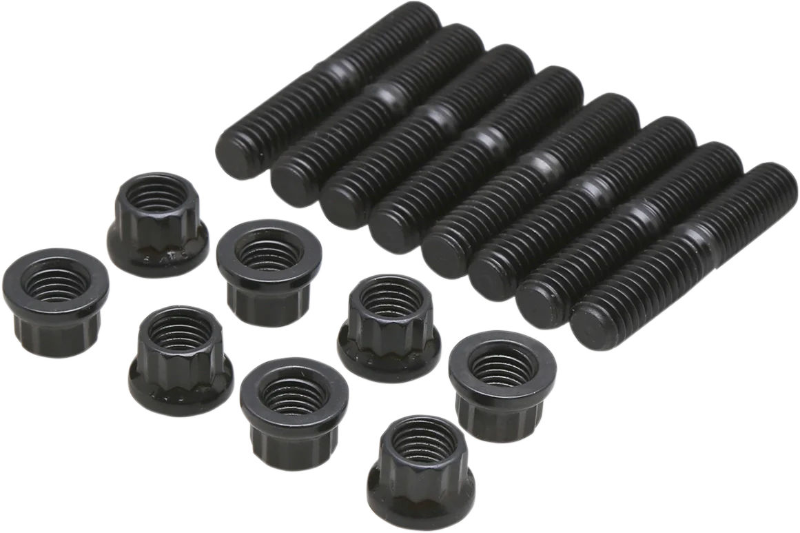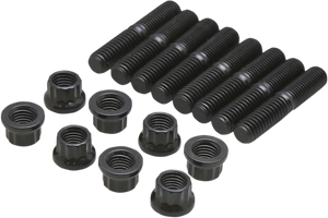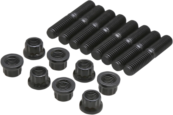Nuts are machined from billet high-tensile steel and heat treated. All are black oxide-treated for enhanced corrosion resistance. Studs are heat-treated 180,000 psi aircraft alloy steel. Studs and nuts have rolled threads. Made in the U.S.A..