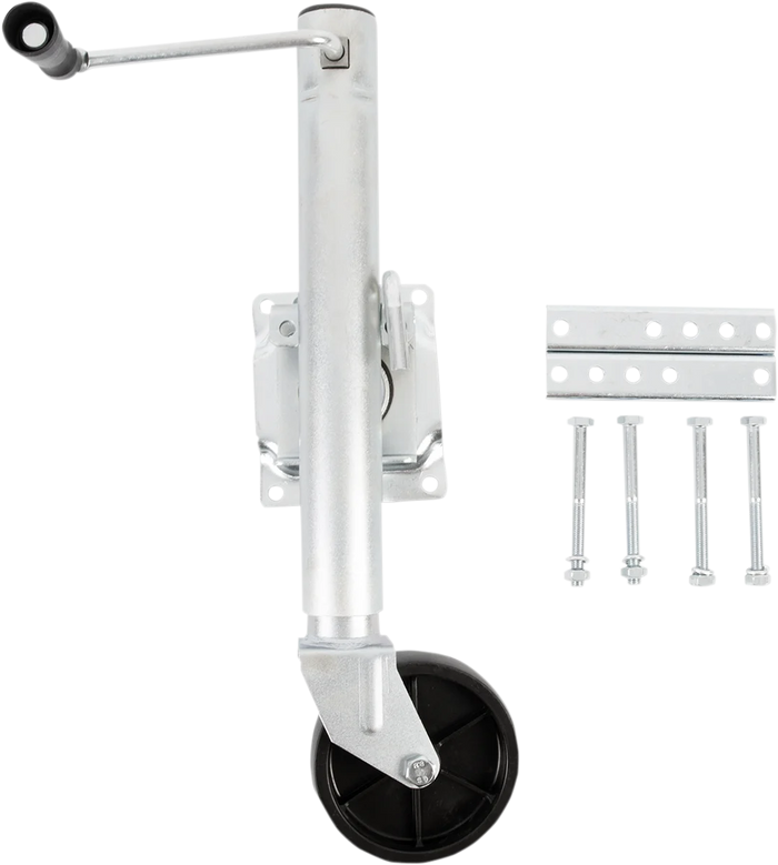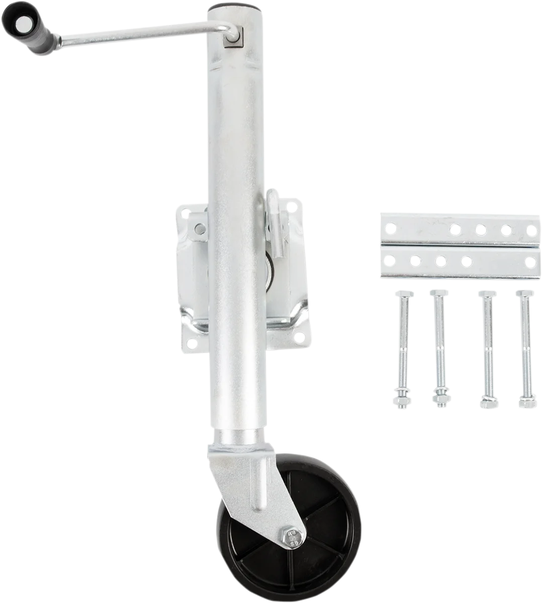 1,500 single-wheel. 6" swivel for easy maneuvering. Lifts from 14" to 24". Fits up to 3" x 5" trailer tongue. Easy toggle when pulling pin. Protective finish for corrosion resistance. Mounting hardware included.