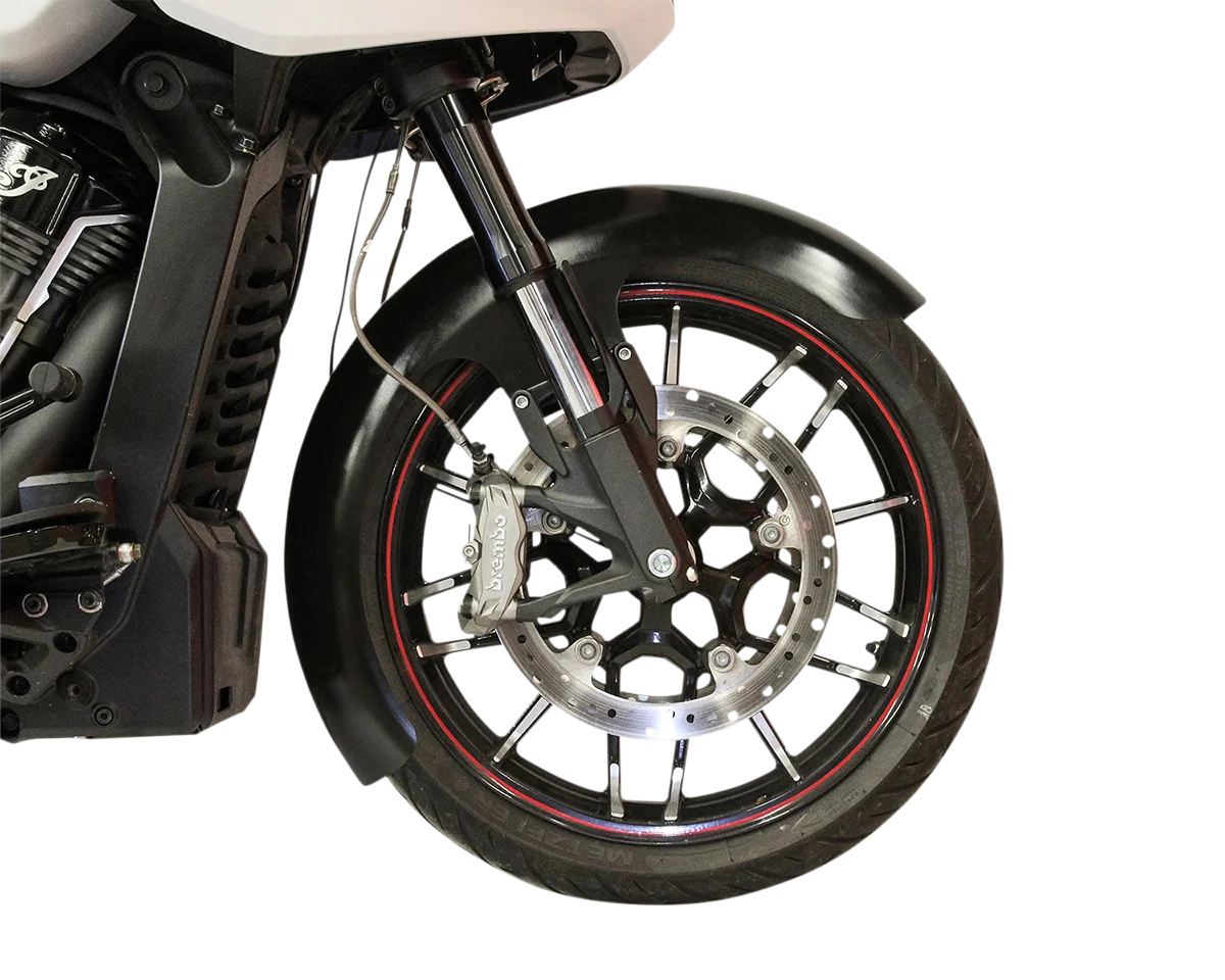 Lose the rivets and square edge look. Stamped steel 14-gauge fender for smooth consistent finish. 13-Step E-coated factory-style finish resists corrosion. Laser cut and pre-drilled for perfect fit. Experienced increased torsional rigidity as the stronger steel acts as brace. Gloss Black mounting blocks and Zinc hardware included. Made in the USA. Can be drilled and wired for factory lighted headress..