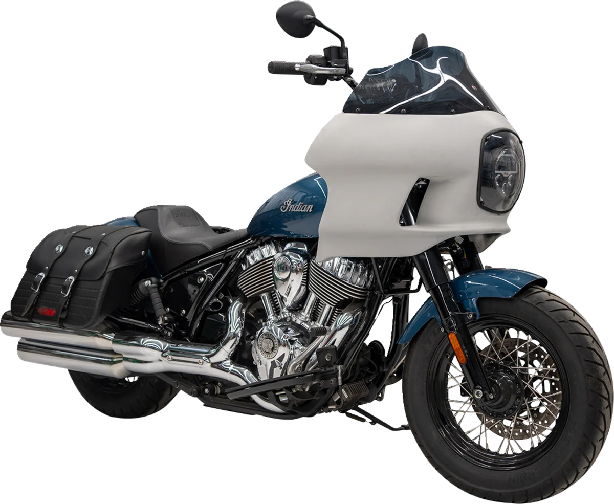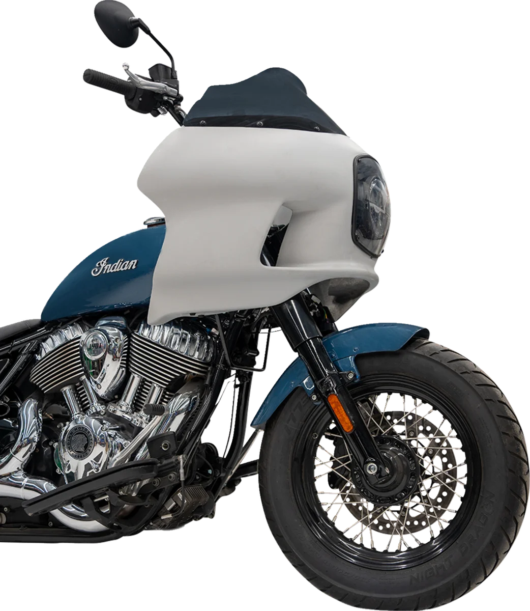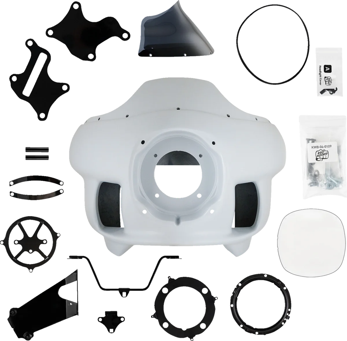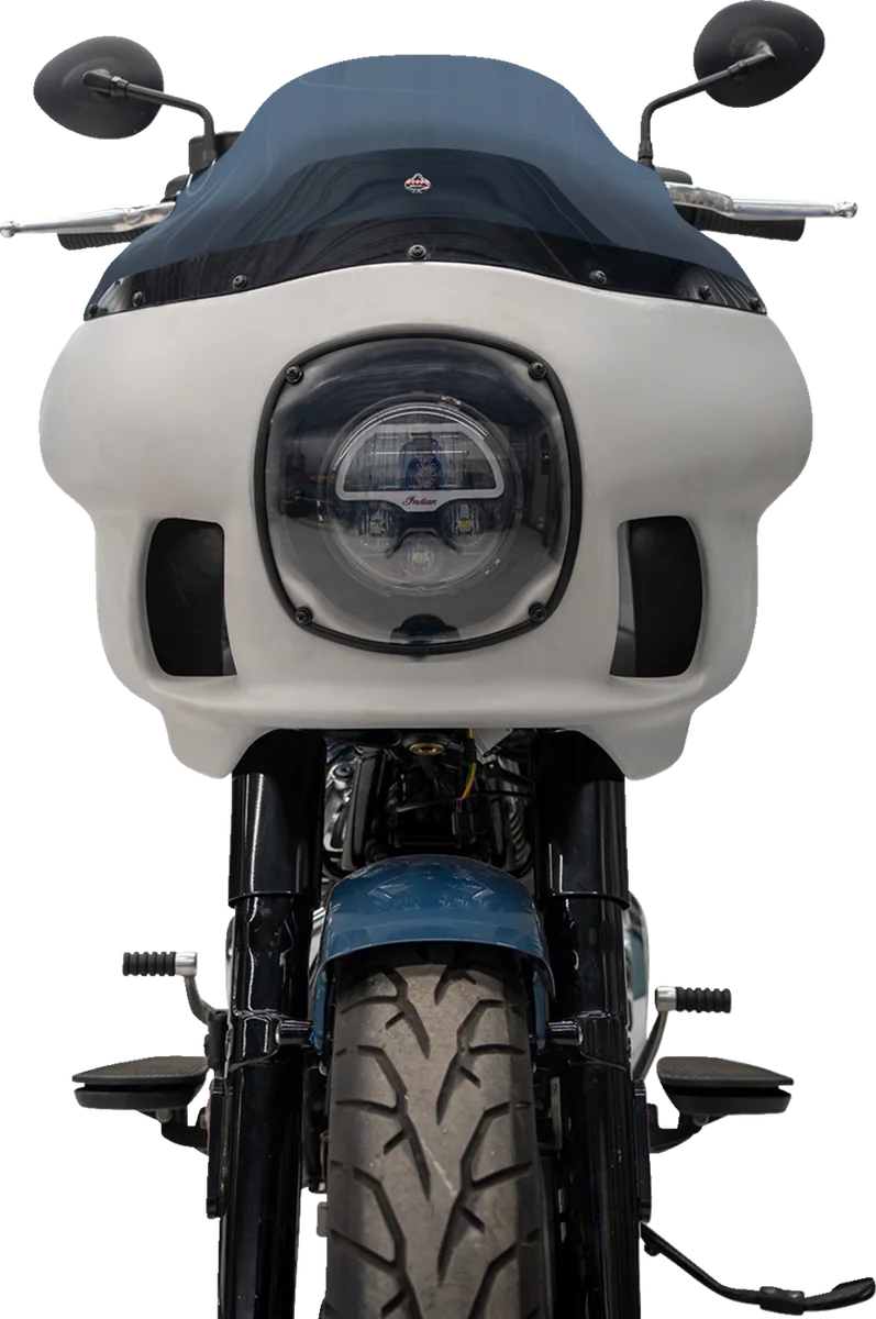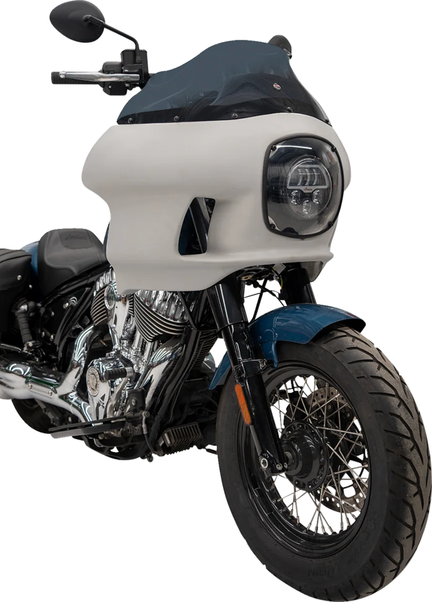 Classic reproduction FXRP-style fairing designed to elevate your motorcycle's style and performance. Brings together the perfect blend of air management, design, and craftsmanship. Comes as a complete kit, ensuring that you have everything you need for a seamless installation. Polyester Primed Fiberglass Fairing – after test fit, it's ready to hand to your painter. Powder-coated neck bracket. 7” headlight mount – headlight not included. Clear headlight cover with gasket. 9” dark smoke Flare™ windshield (part # 2310-0635). All necessary fasteners and hardware. Proudly made in the U.S.A..