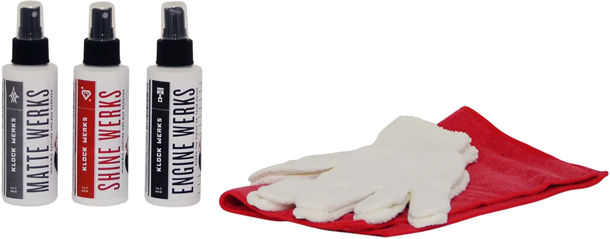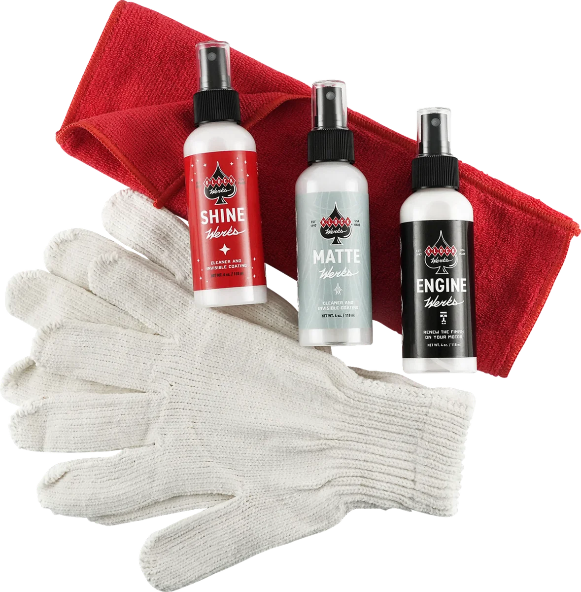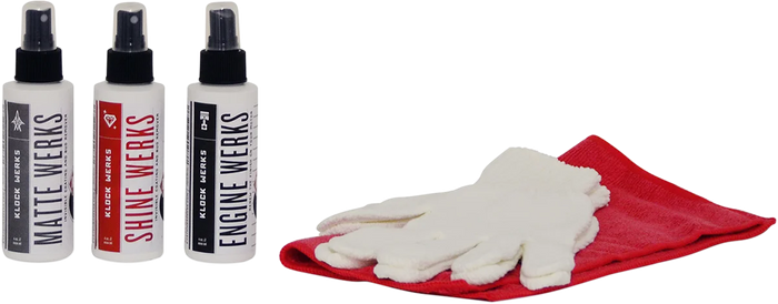 Three different Klock Werks Kleaners packaged in an easy to carry kit. One 4 oz. bottle each of Shine Werks, Matte Werks, and Engine Werks along with Detail Werks microfiber polishing gloves, and a red microfiber towel all included in the Klean Werks Kit. Small enough to fit in a saddlebag to be ready to remove bugs, clean a windshield and even shine up an engine. Use Klock Werks 1-gallon bottles of each Kleaner to refill the 4-ounce bottles.