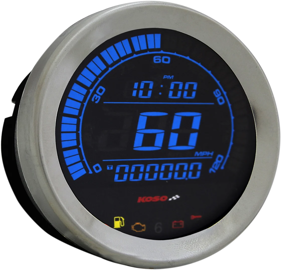 Plug & play. Red and blue changeable LCD display. 4" speedometer includes odometer, trip meter, and clock. 4" tachometer also shows gear position, cruise control, and ABS functions. 2" fuel meter shows percentage of fuel left. 2" volt meter displays 8-16V DC.
