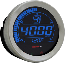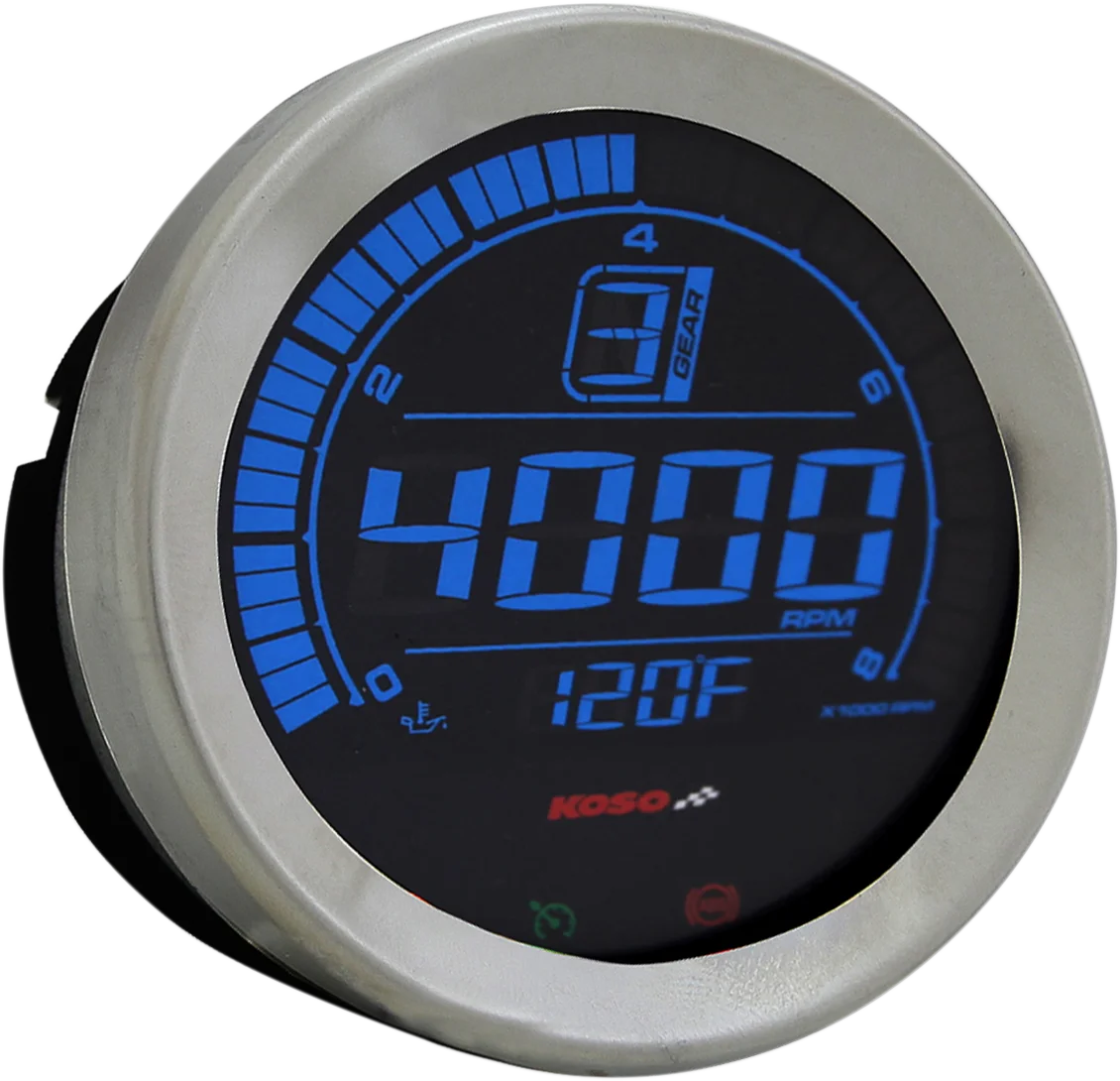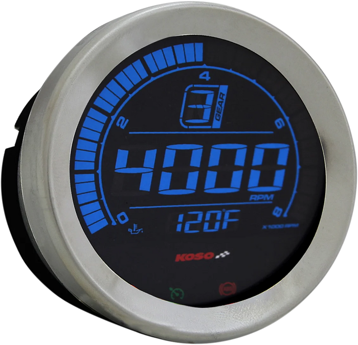 Plug & play. Red and blue changeable LCD display. 4" speedometer includes odometer, trip meter, and clock. 4" tachometer also shows gear position, cruise control, and ABS functions. 2" fuel meter shows percentage of fuel left. 2" volt meter displays 8-16V DC.