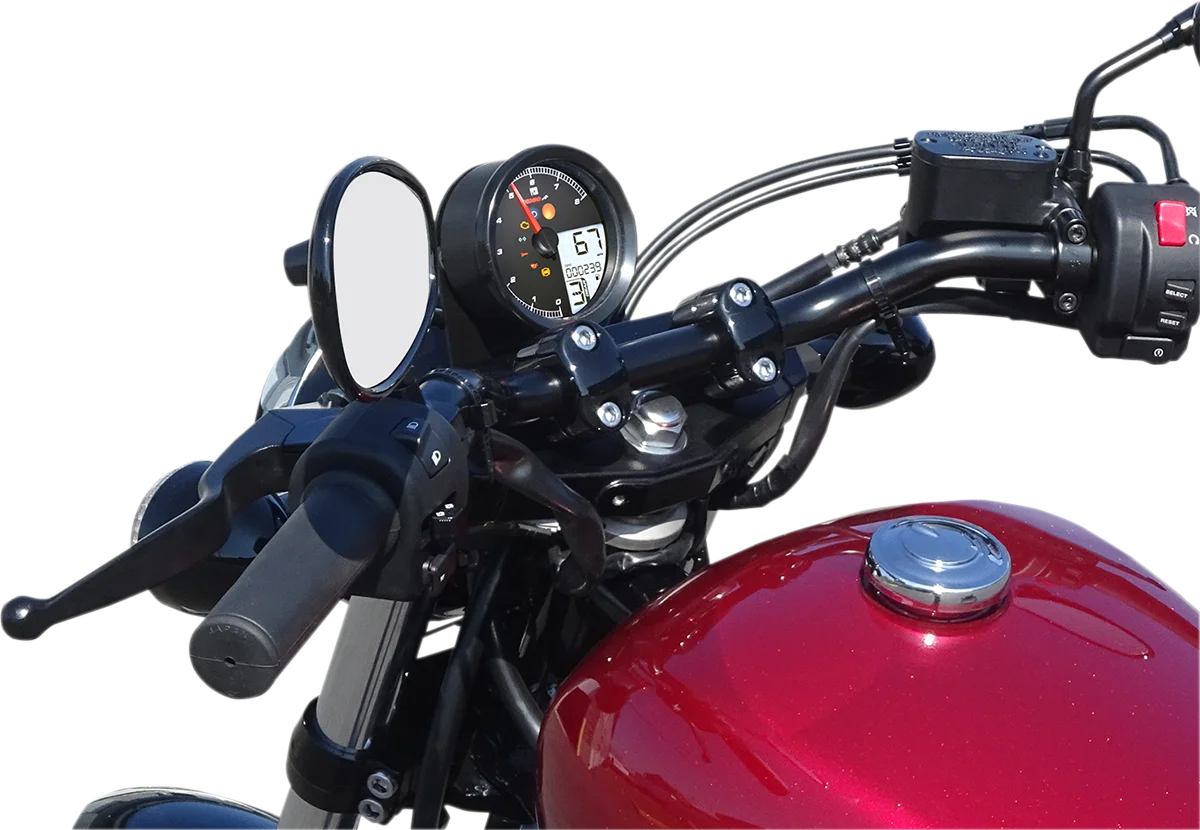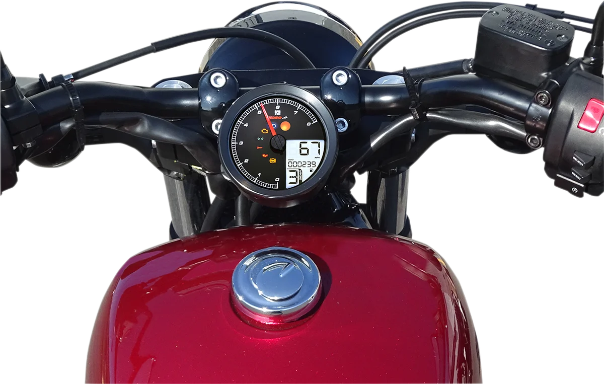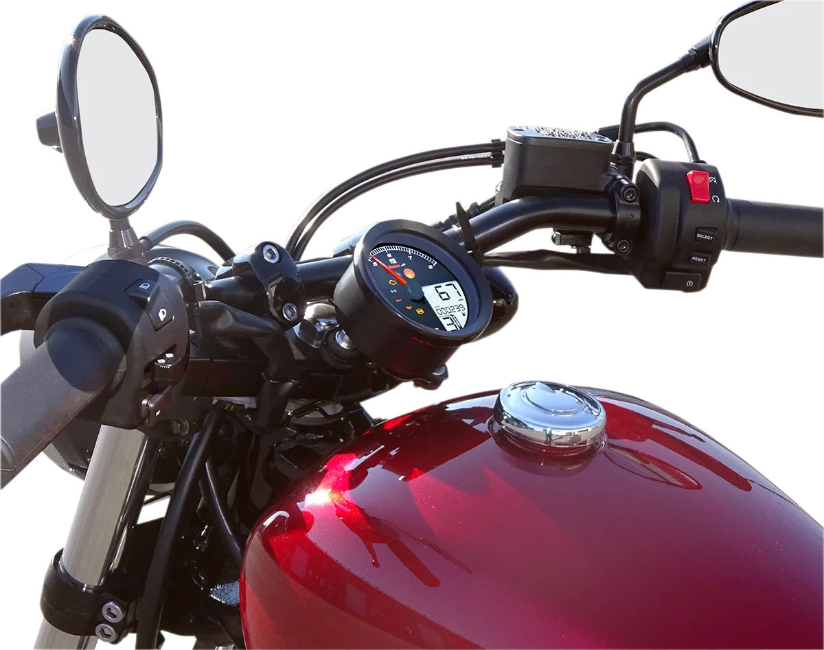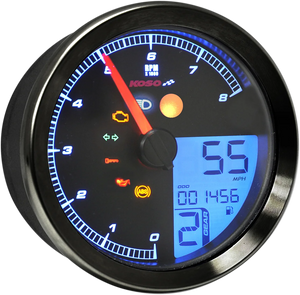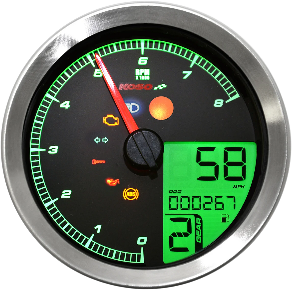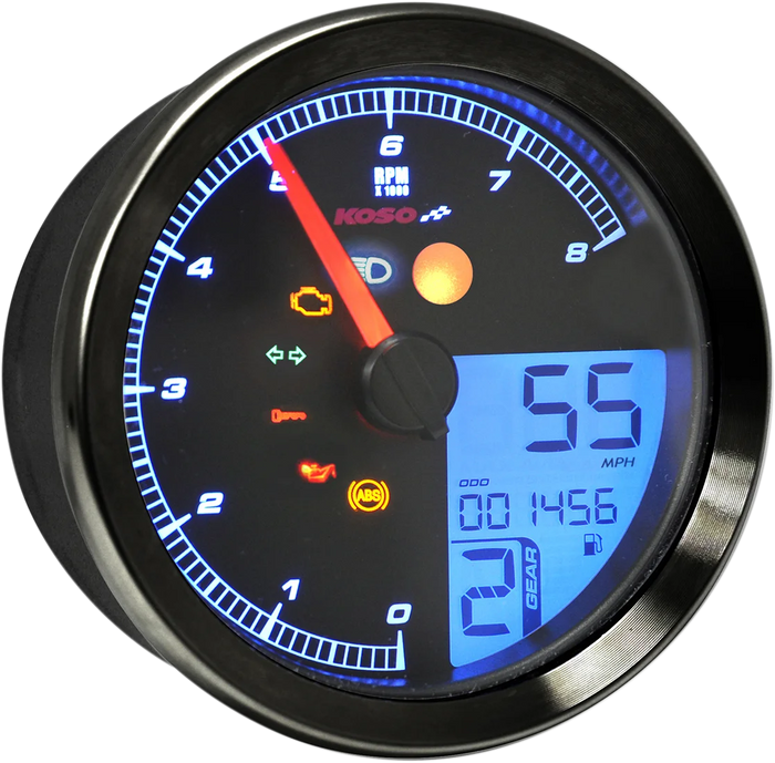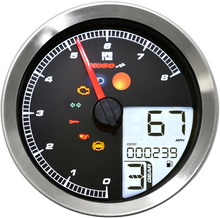 Eight color changeable LCD display. Measures speed (0-225 mph/0-360 km/h), rpm, fuel meter, indicator lights and gear position. Measures 3.3” dia. without bezel; 3.72” dia. with bezel x 2.19” D.
