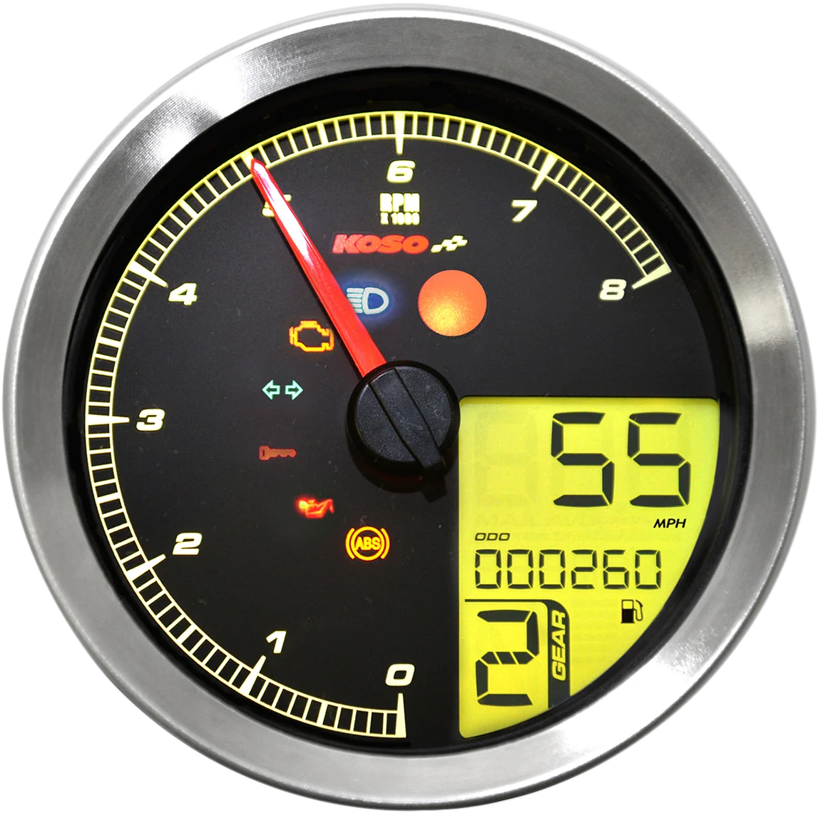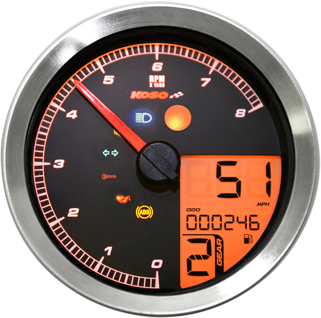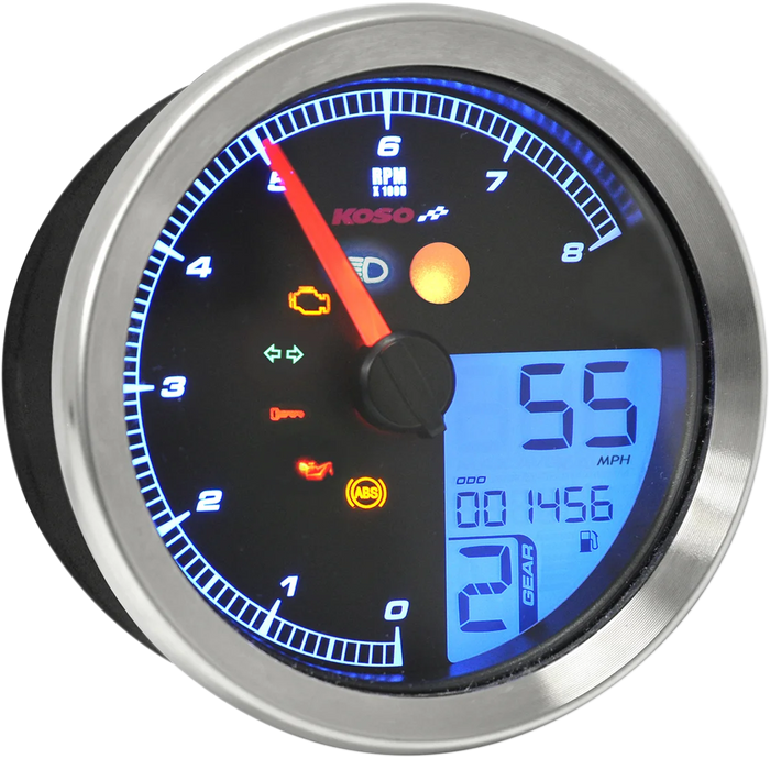 Eight color changeable LCD display. Measures speed (0-225 mph/0-360 km/h), rpm, fuel meter, indicator lights and gear position. Measures 3.3” dia. without bezel; 3.72” dia. with bezel x 2.19” D.