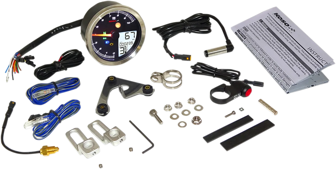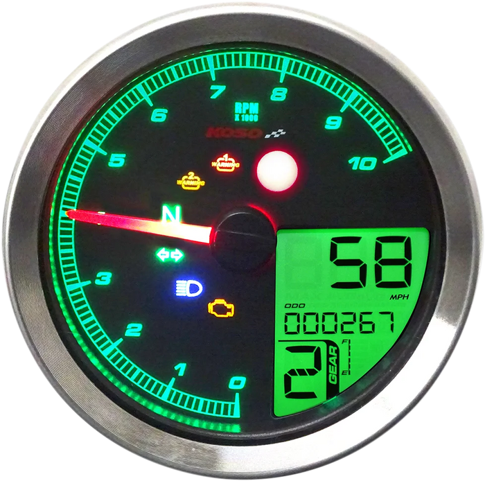 Eight color changeable LCD display. Measures speed (0-225 mph/0-360 km/h), rpm, fuel meter, indicator lights and gear position. Measures 3.3" diameter bezel; 3.72" diameter with bezel x 2.19" D.