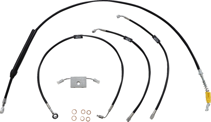 Standard kit includes clutch line, brake lines, chrome "T" brake line junction, banjo bolts, fittings and copper crush washers. Correct length brake/clutch lines and wire extensions included to complete a handlebar swap. Made in the U.S.A.. Electrical wire extensions NOT included (available separately).. Kit is based on using 2" risers with Ape Hanger handlebars..