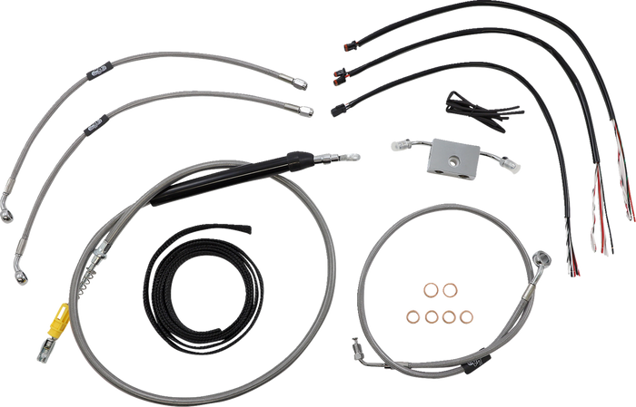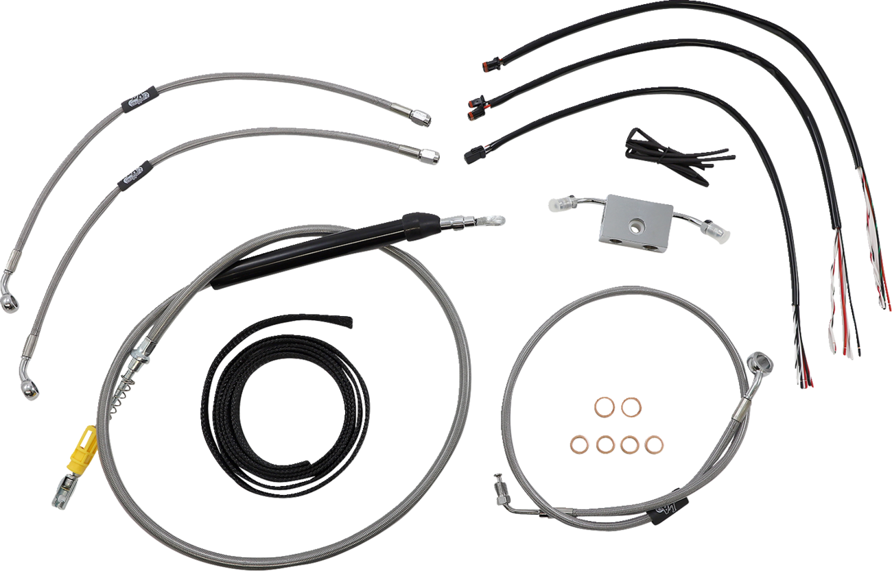 Take "cable calculation" headaches out of swapping handlebars. Kit includes the correct length cables, brake lines and wire extensions you need so you can complete a handlebar swap. Stainless braided kit includes throttle cable, idle cable (unless noted), clutch cable, brake lines, chrome "T" brake line junction, banjo bolts, fittings and copper crush washers. Made in the U.S.A.. Kit is based on using 2" risers with Ape Hanger handlebars..