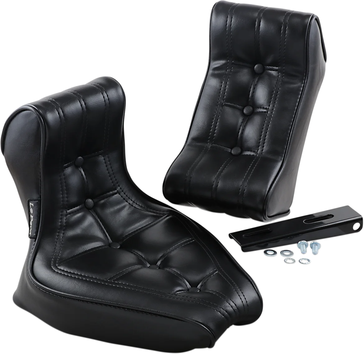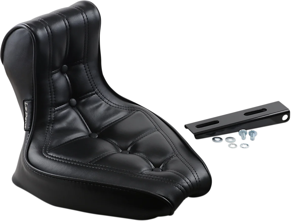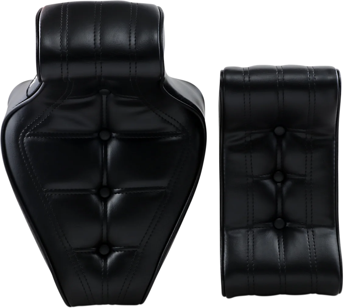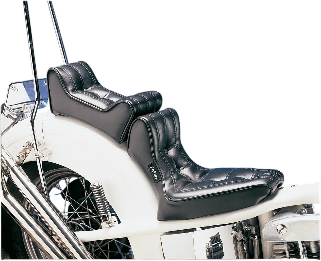 Molded one-piece foam foundation covered with premium grade black vinyl on a 16-gauge powder coated steel base plate. Includes a universal nose bracket and hardware. Seat bottom carpeted to protect the fender. Two-piece seat offers classic styling. Narrower Pillion Area. Made in the U.S.A..