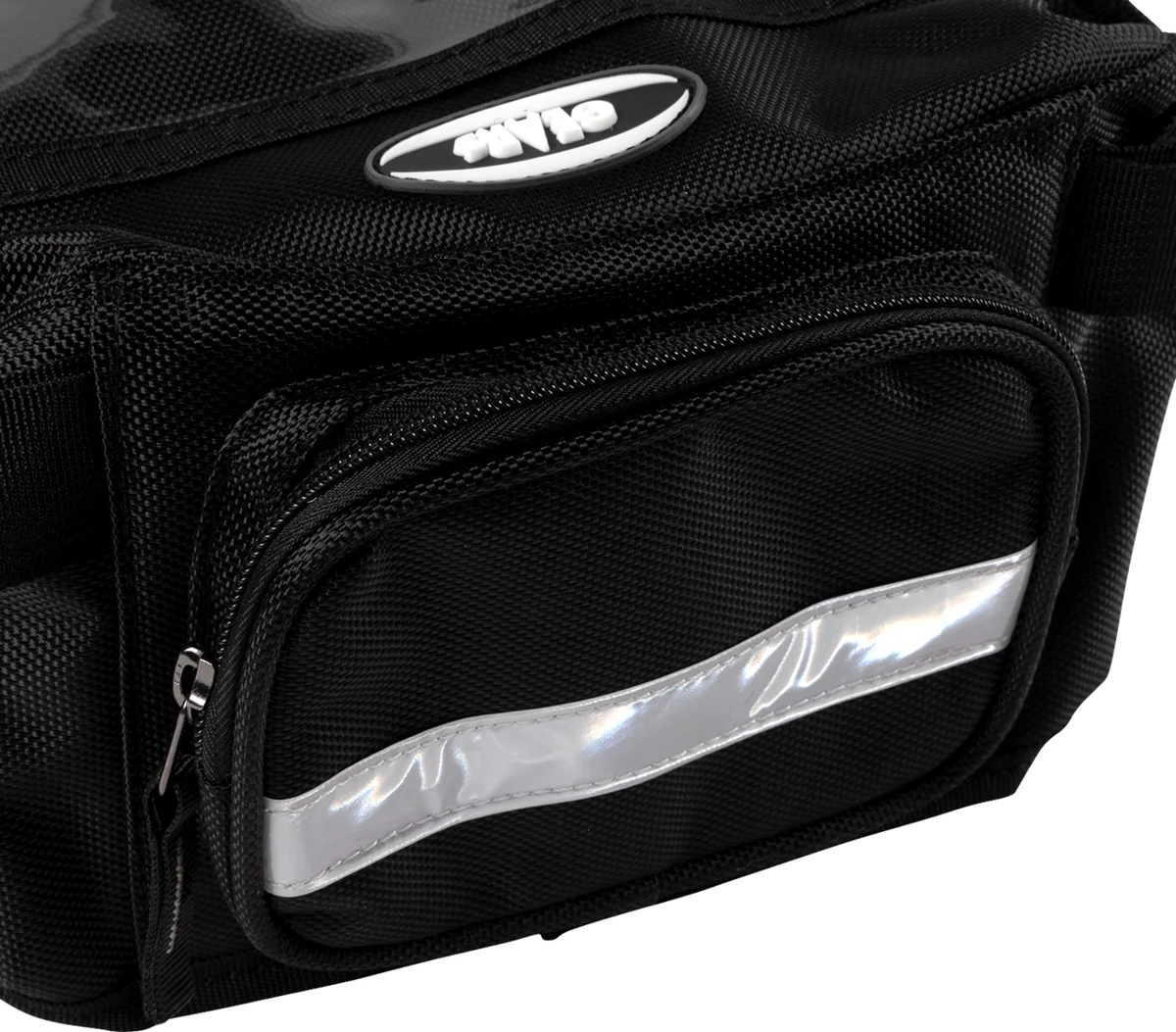 Durable 600-denier Technolast, UV-treated polyester construction with polyurethane coating. Waterproof map pocket on top of bag. Rugged rubber handle. Reflective logo enhances visibility. Extra-long zipper pullers for easy access. Inside net pocket and key ring holder.