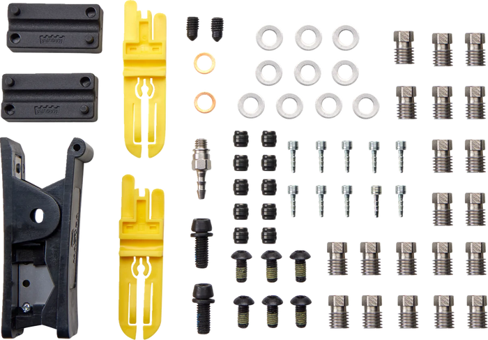 This kit includes 1 tubing cutter, 1 installer clamp, 2 syringes, 2 bleed lines, 20 MT sleeve nuts, 10 olives, 6 rotor bolts, 1 filling adaptor, 2 bleed plugs for rim brakes, 2 transport devices, 10 inserts, 2 caliper bolts, 10 1 mm spacer julie, 2 compression washers, and 1 liter of blue hydraulic brake fluid. Comes with bleeding instruction manual. Designed for bicycle brakes.